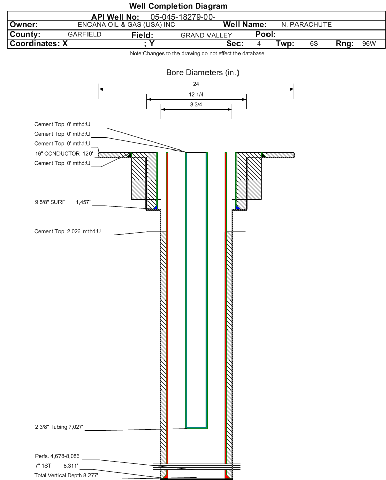 | Wellbore Completed | | Completion Date: | 7/21/2009 | | Spud Date: | 6/24/2009 | Spud Date Is: | ACTUAL | | Measured TD: | 8326 ft. | Measured PB depth: | 8286 ft. | | True Vertical TD: | 8277 ft. | True Vertical PB depth: | 8237 ft. | | Top PZ Location: | Sec:4 Twp: 6S 96W | Footage: 1840 FSL 2292 FEL | | Bottom Hole Location: | Sec:4 Twp: 6S 96W | Footage: 1840 FSL 2292 FEL | | Log Types: | CBL,MUD,RST,ARRAY INDUCTION | | Casing: | String Type: CONDUCTOR, Hole Size: 24 in., Size: 16 in., Top: 0 ft., Depth: 120 ft., Weight: , Citings Type: ACTUAL | | Cement: | Sacks: 390, Top: 0 ft., Bottom: 1203 ft., Determination Method: | | Casing: | String Type: SURF, Hole Size: 12.25 in., Size: 9.625 in., Top: 0 ft., Depth: 1457 ft., Weight: , Citings Type: ACTUAL | | Cement: | Sacks: 332, Top: 0 ft., Bottom: 1457 ft., Determination Method: | | Casing: | String Type: 1ST, Hole Size: 8.75 in., Size: 7 in., Top: 0 ft., Depth: 8311 ft., Weight: , Citings Type: ACTUAL | | Cement: | Sacks: 611, Top: 2026 ft., Bottom: 8311 ft., Determination Method: CBL | | Casing: | String Type: 3RD, Hole Size: , Size: , Top: 0 ft., Depth: , Weight: , Citings Type: ACTUAL | | Cement: | Sacks: , Top: , Bottom: , Determination Method: | | Casing: | String Type: 1ST LINER, Hole Size: , Size: , Top: 0 ft., Depth: , Weight: , Citings Type: ACTUAL | | Cement: | Sacks: , Top: , Bottom: , Determination Method: | | Formation | Interval Top | Log Bottom | Cored | DSTs | | WILLIAMS FORK | 4669 ft. | 8132 ft. | N | N | | ROLLINS | 8132 ft. | 8326 ft. | N | N |