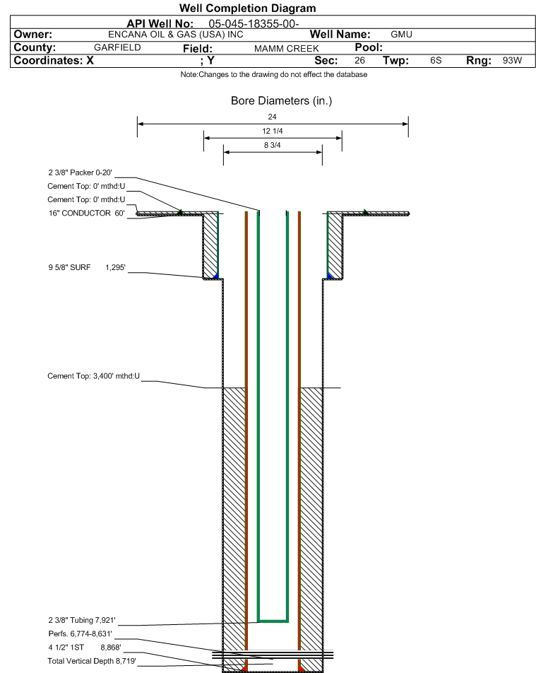 | Wellbore Completed | | Completion Date: | 4/12/2010 | | Spud Date: | 4/2/2010 | Spud Date Is: | ACTUAL | | Measured TD: | 8883 ft. | Measured PB depth: | 8821 ft. | | True Vertical TD: | 8719 ft. | True Vertical PB depth: | 8657 ft. | | Top PZ Location: | Sec:26 Twp: 6S 93W | Footage: 2615 FNL 1005 FWL | | Bottom Hole Location: | Sec:26 Twp: 6S 93W | Footage: 2636 FNL 1018 FWL | | Log Types: | RST AND CBL | | Casing: | String Type: CONDUCTOR, Hole Size: 24 in., Size: 16 in., Top: 0 ft., Depth: 60 ft., Weight: , Citings Type: ACTUAL | | Cement: | Sacks: , Top: , Bottom: 40 ft., Determination Method: CALC | | Casing: | String Type: SURF, Hole Size: 12.25 in., Size: 9.625 in., Top: 0 ft., Depth: 1295 ft., Weight: , Citings Type: ACTUAL | | Cement: | Sacks: 416, Top: 0 ft., Bottom: 1295 ft., Determination Method: CALC | | Casing: | String Type: 1ST, Hole Size: 8.75 in., Size: 4.5 in., Top: 0 ft., Depth: 8868 ft., Weight: , Citings Type: ACTUAL | | Cement: | Sacks: 986, Top: 3400 ft., Bottom: 8868 ft., Determination Method: CBL | | Formation | Interval Top | Log Bottom | Cored | DSTs | | WILLIAMS FORK | 4919 ft. | 6767 ft. | | | | ROLLINS | 8692 ft. | 8883 ft. | | |