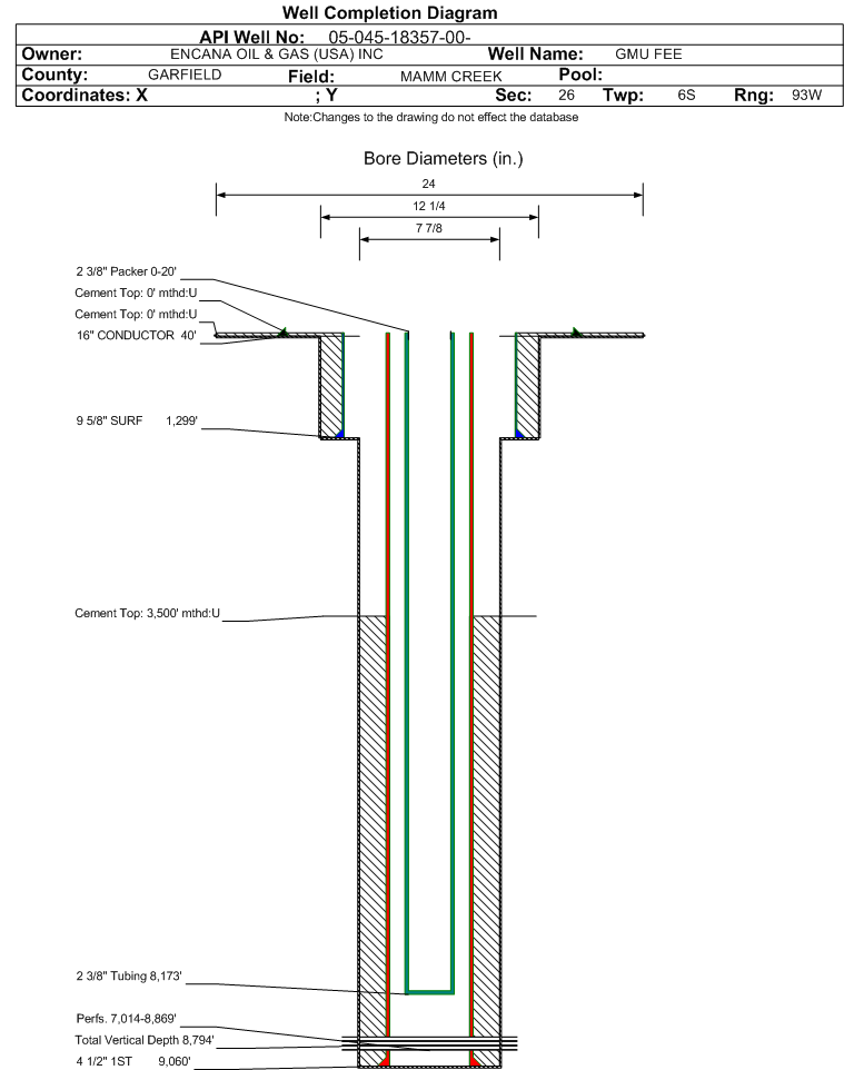 Wellbore #00 Wellbore Classification: GW Status: PR - 2/1/2011 Measured TD: 9079 ft. Vertical TD: 8794 ft.| Wellbore Data for Original Wellbore | Wellbore Classification: GW PR - 2/1/2011 | | Wellbore Permit | DIRECTIONAL | | Permit #: | | Expiration Date: | 3/14/2011 | | Proposed Top PZ Location: | Sec:27 Twp: 6S 93W | Footage: 1760 FSL 1640 FEL | | Bottom Hole Location: | Sec:27 Twp: 6S 93W | Footage: 1760 FSL 1640 FEL | | Proposed Depth/Form: | 9204 ft. | | Surface Mineral Owner Same: | No | | Mineral Owner: | FEE | Surface Owner: | STATE | | Unit: | GRASS MESA | Unit Number: | COC56608A | | Formation And Spacing: | Code: ILES , Formation: ILES , Order: , Unit Acreage: , Drill Unit: | | Formation And Spacing: | Code: WMFK , Formation: WILLIAMS FORK , Order: , Unit Acreage: , Drill Unit: | | Casing: | String Type: CONDUCTOR, Hole Size: 24 in., Size: 16 in., Top: , Depth: 40 ft., Weight: LINEPIPE , Citings Type: PLANNED | | Cement: | Sacks: 5, Top: 0 ft., Bottom: 40 ft. | | Casing: | String Type: SURF, Hole Size: 12.25 in., Size: 9.625 in., Top: , Depth: 1269 ft., Weight: 36 , Citings Type: PLANNED | | Cement: | Sacks: 433, Top: 0 ft., Bottom: 1269 ft. | | Casing: | String Type: 1ST, Hole Size: 8.75 in., Size: 4.5 in., Top: , Depth: 9204 ft., Weight: 11.6 , Citings Type: PLANNED | | Cement: | Sacks: 1055, Top: 0 ft., Bottom: 9204 ft. |