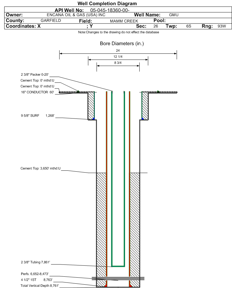 Wellbore #00 Wellbore Classification: GW Status: PR - 2/1/2011 Measured TD: 8778 ft. Vertical TD: 8761 ft.| Wellbore Data for Original Wellbore | Wellbore Classification: GW PR - 2/1/2011 | | Wellbore Permit | DIRECTIONAL | | Permit #: | | Expiration Date: | 3/14/2011 | | Proposed Top PZ Location: | Sec:27 Twp: 6S 93W | Footage: 1440 FNL 190 FEL | | Bottom Hole Location: | Sec:27 Twp: 6S 93W | Footage: 1440 FNL 190 FEL | | Proposed Depth/Form: | 8760 ft. | | Surface Mineral Owner Same: | No | | Mineral Owner: | FEE | Surface Owner: | FEDERAL | | Unit: | GRASS MESA | Unit Number: | COC56608A | | Formation And Spacing: | Code: ILES , Formation: ILES , Order: , Unit Acreage: , Drill Unit: | | Formation And Spacing: | Code: WMFK , Formation: WILLIAMS FORK , Order: , Unit Acreage: , Drill Unit: | | Casing: | String Type: CONDUCTOR, Hole Size: 24 in., Size: 16 in., Top: , Depth: 40 ft., Weight: LINEPIPE , Citings Type: PLANNED | | Cement: | Sacks: 5, Top: 0 ft., Bottom: 40 ft. | | Casing: | String Type: SURF, Hole Size: 12.25 in., Size: 9.625 in., Top: , Depth: 1245 ft., Weight: 36 , Citings Type: PLANNED | | Cement: | Sacks: 242, Top: 0 ft., Bottom: 1245 ft. | | Casing: | String Type: 1ST, Hole Size: 7.875 in., Size: 4.5 in., Top: , Depth: 8760 ft., Weight: 11.6 , Citings Type: PLANNED | | Cement: | Sacks: 1049, Top: 500 ft., Bottom: 8760 ft. |