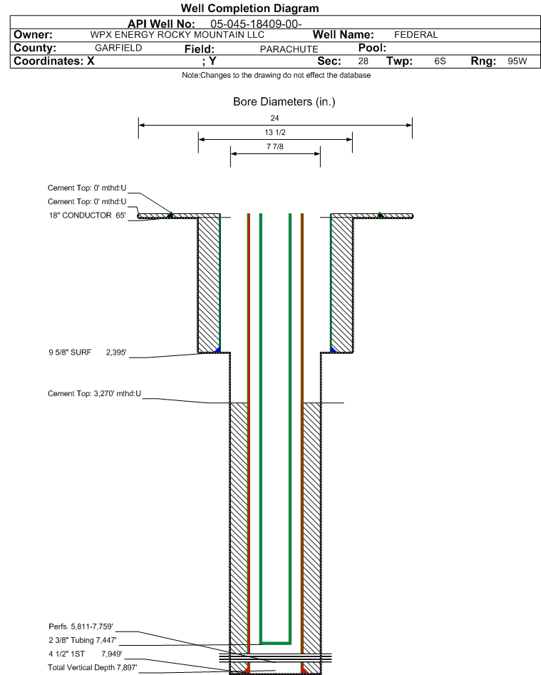 | Wellbore Completed | | Completion Date: | 11/20/2009 | | Spud Date: | 11/13/2009 | Spud Date Is: | ACTUAL | | Measured TD: | 7969 ft. | Measured PB depth: | 7900 ft. | | True Vertical TD: | 7897 ft. | True Vertical PB depth: | 7828 ft. | | Top PZ Location: | Sec:28 Twp: 6S 95W | Footage: 1027 FNL 1846 FEL | | Bottom Hole Location: | Sec:28 Twp: 6S 95W | Footage: 1055 FNL 1873 FEL | | Log Types: | CBL; RPM | | Log Types: | CBL, MUD | | Casing: | String Type: CONDUCTOR, Hole Size: 24 in., Size: 18 in., Top: 0 ft., Depth: 65 ft., Weight: , Citings Type: ACTUAL | | Cement: | Sacks: 25, Top: 0 ft., Bottom: 65 ft., Determination Method: VISU | | Casing: | String Type: SURF, Hole Size: 13.5 in., Size: 9.625 in., Top: 0 ft., Depth: 2395 ft., Weight: , Citings Type: ACTUAL | | Cement: | Sacks: 530, Top: 0 ft., Bottom: 2395 ft., Determination Method: VISU | | Casing: | String Type: 1ST, Hole Size: 7.875 in., Size: 4.5 in., Top: 0 ft., Depth: 7949 ft., Weight: , Citings Type: ACTUAL | | Cement: | Sacks: 920, Top: 3270 ft., Bottom: 7949 ft., Determination Method: CBL | | Formation | Interval Top | Log Bottom | Cored | DSTs | | GREELEY SAND | 2130 ft. | | | | | WASATCH G | 2130 ft. | | N | N | | MESAVERDE | 4393 ft. | | | | | CAMEO | 7104 ft. | | | | | ROLLINS | 7839 ft. | | | |