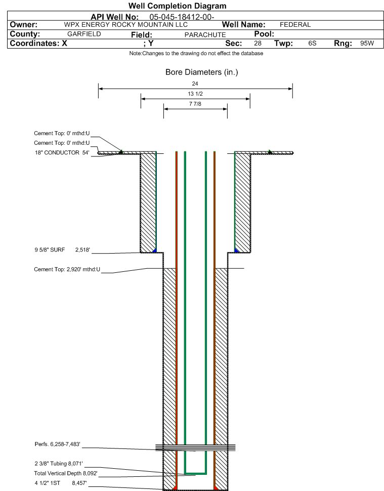 Wellbore #00 Wellbore Classification: GW Status: PR - 4/16/2011 Measured TD: 8480 ft. Vertical TD: 8092 ft.| Wellbore Data for Original Wellbore | Wellbore Classification: GW PR - 4/16/2011 | | Wellbore Permit | DIRECTIONAL | | Permit #: | 20090758 | Expiration Date: | 4/19/2010 | | Proposed Top PZ Location: | Sec: Twp: | Footage: 468 FNL 688 FEL | | Bottom Hole Location: | Sec:28 Twp: 6S 95W | Footage: 468 FNL 688 FEL | | Proposed Depth/Form: | 8365 ft. | | Surface Mineral Owner Same: | Yes | | Mineral Owner: | FEDERAL | Surface Owner: | FEDERAL | | Unit: | | Unit Number: | | | Formation And Spacing: | Code: WMFK , Formation: WILLIAMS FORK , Order: 440-25 , Unit Acreage: 320, Drill Unit: E2 |