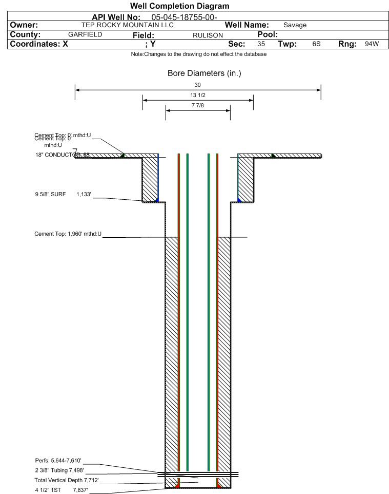| Wellbore Completed | | Completion Date: | 7/11/2010 | | Spud Date: | 6/30/2010 | Spud Date Is: | ACTUAL | | Measured TD: | 7850 ft. | Measured PB depth: | 7786 ft. | | True Vertical TD: | 7712 ft. | True Vertical PB depth: | 7648 ft. | | Top PZ Location: | Sec:35 Twp: 6S 94W | Footage: 1858 FNL 2066 FEL | | Bottom Hole Location: | Sec:35 Twp: 6S 94W | Footage: 1875 FNL 2074 FEL | | Log Types: | CBL/MUD/RPM/Triple Combo on 045-18749 | | Casing: | String Type: CONDUCTOR, Hole Size: 30 in., Size: 18 in., Top: 0 ft., Depth: 88 ft., Weight: 47.4 , Citings Type: ACTUAL | | Cement: | Sacks: 33, Top: 0 ft., Bottom: 88 ft., Determination Method: VISU | | Casing: | String Type: SURF, Hole Size: 13.5 in., Size: 9.625 in., Top: 0 ft., Depth: 1133 ft., Weight: 32.3 , Citings Type: ACTUAL | | Cement: | Sacks: 320, Top: 0 ft., Bottom: 1133 ft., Determination Method: VISU | | Casing: | String Type: 1ST, Hole Size: 7.875 in., Size: 4.5 in., Top: 0 ft., Depth: 7837 ft., Weight: 11.6 , Citings Type: ACTUAL | | Cement: | Sacks: 1140, Top: 1960 ft., Bottom: 7837 ft., Determination Method: CBL | | Formation | Interval Top | Log Bottom | Cored | DSTs | | WASATCH G | 1418 ft. | | | | | MESAVERDE | 4068 ft. | | | | | WILLIAMS FORK | 4068 ft. | | | | | CAMEO | 6813 ft. | | | | | ROLLINS | 7757 ft. | | | |