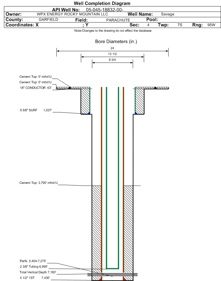 Wellbore #00 Wellbore Classification: GW Status: PR - 4/11/2011 Measured TD: 7450 ft. Vertical TD: 7160 ft.| Wellbore Data for Original Wellbore | Wellbore Classification: GW PR - 4/11/2011 | | Wellbore Permit | DIRECTIONAL | | Permit #: | | Expiration Date: | 11/17/2012 | | Proposed Top PZ Location: | Sec:4 Twp: 7S 95W | Footage: 799 FSL 645 FEL | | Bottom Hole Location: | Sec:4 Twp: 7S 95W | Footage: 799 FSL 645 FEL | | Proposed Depth/Form: | 7390 ft. | | Surface Mineral Owner Same: | No | | Mineral Owner: | FEDERAL | Surface Owner: | FEE | | Unit: | | Unit Number: | | | Formation And Spacing: | Code: WMFK , Formation: WILLIAMS FORK , Order: 440-35 , Unit Acreage: 640, Drill Unit: All | | Casing: | String Type: CONDUCTOR, Hole Size: 24 in., Size: 18 in., Top: , Depth: 45 ft., Weight: 48 , Citings Type: PLANNED | | Cement: | Sacks: 25, Top: 0 ft., Bottom: 45 ft. | | Casing: | String Type: SURF, Hole Size: 13.5 in., Size: 9.625 in., Top: , Depth: 2138 ft., Weight: 32.3 , Citings Type: PLANNED | | Cement: | Sacks: 737, Top: 0 ft., Bottom: 2138 ft. | | Casing: | String Type: 1ST, Hole Size: 7.875 in., Size: 4.5 in., Top: , Depth: 7390 ft., Weight: 11.6 , Citings Type: PLANNED | | Cement: | Sacks: 583, Top: 3803 ft., Bottom: 7390 ft. |