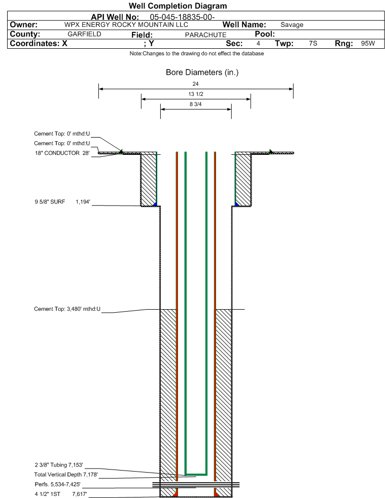Wellbore #00 Wellbore Classification: GW Status: PR - 7/31/2011 Measured TD: 7631 ft. Vertical TD: 7178 ft.| Wellbore Data for Original Wellbore | Wellbore Classification: GW PR - 7/31/2011 | | Wellbore Permit | DIRECTIONAL | | Permit #: | | Expiration Date: | 11/18/2012 | | Proposed Top PZ Location: | Sec:4 Twp: 7S 95W | Footage: 2110 FSL 1953 FEL | | Bottom Hole Location: | Sec:4 Twp: 7S 95W | Footage: 2110 FSL 1953 FEL | | Proposed Depth/Form: | 7657 ft. | | Surface Mineral Owner Same: | No | | Mineral Owner: | FEE | Surface Owner: | FEE | | Unit: | | Unit Number: | | | Formation And Spacing: | Code: WMFK , Formation: WILLIAMS FORK , Order: 440-35 , Unit Acreage: 640, Drill Unit: All | | Casing: | String Type: CONDUCTOR, Hole Size: 24 in., Size: 18 in., Top: , Depth: 45 ft., Weight: 48 , Citings Type: PLANNED | | Cement: | Sacks: 25, Top: 0 ft., Bottom: 45 ft. | | Casing: | String Type: SURF, Hole Size: 13.5 in., Size: 9.625 in., Top: , Depth: 1188 ft., Weight: 32.3 , Citings Type: PLANNED | | Cement: | Sacks: 414, Top: 0 ft., Bottom: 1188 ft. | | Casing: | String Type: 1ST, Hole Size: 7.875 in., Size: 4.5 in., Top: , Depth: 7657 ft., Weight: 11.6 , Citings Type: PLANNED | | Cement: | Sacks: 593, Top: 3807 ft., Bottom: 7657 ft. |