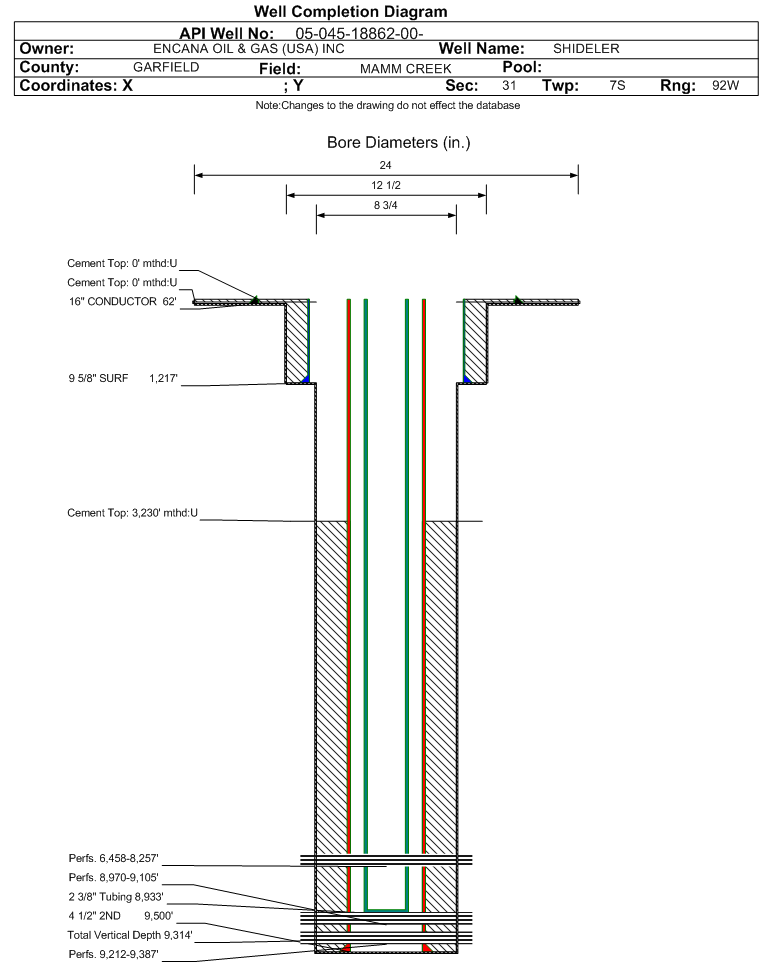 | | Perforation Data: | | Interval Top: | 9212 ft. | # Of Holes: | 27 | | Interval Bottom: | 9387 ft. | Hole Size: | 0.34 in. |