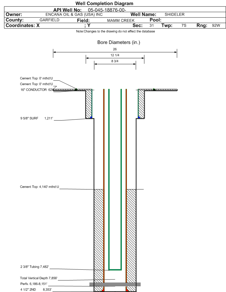 | Wellbore Completed | | Completion Date: | 6/25/2010 | | Spud Date: | 4/28/2010 | Spud Date Is: | ACTUAL | | Measured TD: | 8363 ft. | Measured PB depth: | 8307 ft. | | True Vertical TD: | 7856 ft. | True Vertical PB depth: | 7800 ft. | | Top PZ Location: | Sec:30 Twp: 7S 92W | Footage: 207 FSL 1536 FEL | | Bottom Hole Location: | Sec:30 Twp: 7S 92W | Footage: 242 FSL 1472 FEL | | Log Types: | CBL, RST, Mud & Temp | | Casing: | String Type: CONDUCTOR, Hole Size: 26 in., Size: 16 in., Top: 0 ft., Depth: 62 ft., Weight: Line pipe, Citings Type: ACTUAL | | Cement: | Sacks: , Top: 0 ft., Bottom: 40 ft., Determination Method: CALC | | Casing: | String Type: SURF, Hole Size: 12.25 in., Size: 9.625 in., Top: 0 ft., Depth: 1211 ft., Weight: 36# , Citings Type: ACTUAL | | Cement: | Sacks: 413, Top: 0 ft., Bottom: 1211 ft., Determination Method: CALC | | Casing: | String Type: 2ND, Hole Size: 8.75 in., Size: 4.5 in., Top: 0 ft., Depth: 8353 ft., Weight: 11.6 , Citings Type: ACTUAL | | Cement: | Sacks: 1350, Top: 4140 ft., Bottom: 8363 ft., Determination Method: CBL | | Formation | Interval Top | Log Bottom | Cored | DSTs | | WILLIAMS FORK | 5369 ft. | 8363 ft. | N | N |