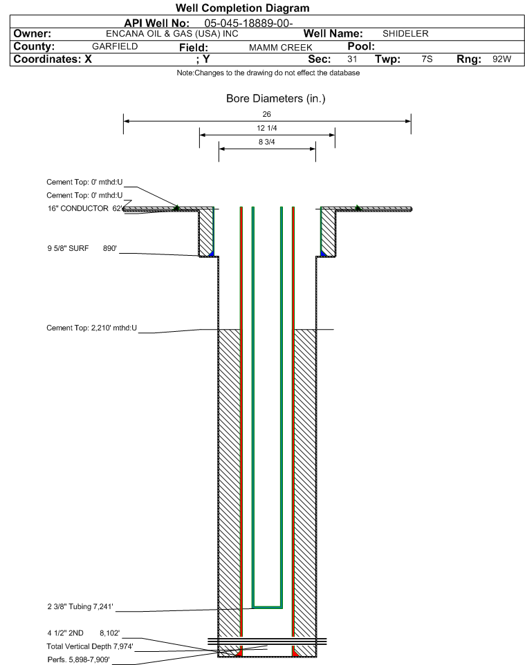 Formation WMFK Formation Classification: GW Status: SI - 6/1/2025 Interval Top: 5898 ft. Interval Bottom: 7909 ft.| Completed Information for Formation WILLIAMS FORK | | 1st Production Date: | 2/6/2011 | Choke Size: | | | Formation Name: | WILLIAMS FORK | Commingled: | No | | Production Method: | | | Open Hole Completion: | No |
