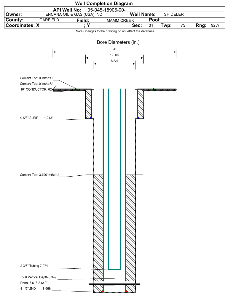 | Wellbore Completed | | Completion Date: | 6/3/2010 | | Spud Date: | 5/1/2010 | Spud Date Is: | ACTUAL | | Measured TD: | 8976 ft. | Measured PB depth: | 8911 ft. | | True Vertical TD: | 8349 ft. | True Vertical PB depth: | 8284 ft. | | Top PZ Location: | Sec:25 Twp: 7S 93W | Footage: 1899 FSL 1030 FEL | | Bottom Hole Location: | Sec:25 Twp: 7S 93W | Footage: 1884 FSL 1044 FEL | | Log Types: | RST, CBL, Temp and Mud | | Casing: | String Type: CONDUCTOR, Hole Size: 26 in., Size: 16 in., Top: 0 ft., Depth: 62 ft., Weight: Line pipe, Citings Type: ACTUAL | | Cement: | Sacks: , Top: 0 ft., Bottom: 40 ft., Determination Method: CALC | | Casing: | String Type: SURF, Hole Size: 12.25 in., Size: 9.625 in., Top: 0 ft., Depth: 1313 ft., Weight: 36# , Citings Type: ACTUAL | | Cement: | Sacks: 429, Top: 0 ft., Bottom: 1313 ft., Determination Method: CALC | | Casing: | String Type: 2ND, Hole Size: 8.75 in., Size: 4.5 in., Top: 0 ft., Depth: 8966 ft., Weight: 12 , Citings Type: ACTUAL | | Cement: | Sacks: 1024, Top: 3790 ft., Bottom: 8966 ft., Determination Method: CBL | | Formation | Interval Top | Log Bottom | Cored | DSTs | | WILLIAMS FORK | 5729 ft. | 8790 ft. | N | N | | ROLLINS | 8791 ft. | 8976 ft. | N | N |