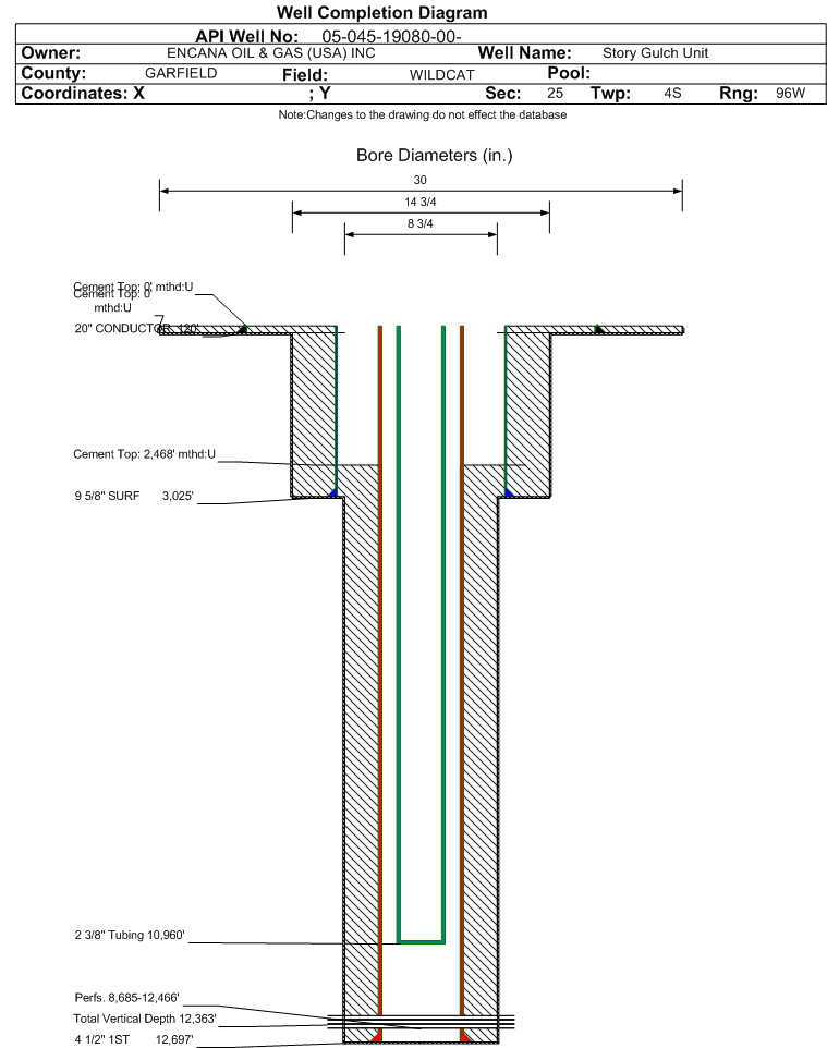 Wellbore #00 Wellbore Classification: GW Status: PR - 12/22/2010 Measured TD: 12720 ft. Vertical TD: 12363 ft.| Wellbore Data for Original Wellbore | Wellbore Classification: GW PR - 12/22/2010 | | Wellbore Permit | DIRECTIONAL | | Permit #: | | Expiration Date: | 2/2/2012 | | Proposed Top PZ Location: | Sec:25 Twp: 4S 96W | Footage: 192 FNL 694 FWL | | Bottom Hole Location: | Sec:25 Twp: 4S 96W | Footage: 192 FNL 694 FWL | | Proposed Depth/Form: | 14068 ft. | | Surface Mineral Owner Same: | No | | Mineral Owner: | FEDERAL | Surface Owner: | FEE | | Unit: | Story Gulch Unt | Unit Number: | COC69333X | | Formation And Spacing: | Code: ILES , Formation: ILES , Order: , Unit Acreage: , Drill Unit: | | Formation And Spacing: | Code: WMFK , Formation: WILLIAMS FORK , Order: 510-13 , Unit Acreage: 10, Drill Unit: | | Casing: | String Type: CONDUCTOR, Hole Size: 26 in., Size: 20 in., Top: , Depth: 120 ft., Weight: Line Pipe, Citings Type: PLANNED | | Cement: | Sacks: 176, Top: 0 ft., Bottom: 120 ft. | | Casing: | String Type: SURF, Hole Size: 14.75 in., Size: 9.625 in., Top: , Depth: 3000 ft., Weight: 36 , Citings Type: PLANNED | | Cement: | Sacks: 2069, Top: 0 ft., Bottom: 3000 ft. | | Casing: | String Type: 2ND, Hole Size: 8.75 in., Size: 4.5 in., Top: , Depth: 14068 ft., Weight: 11.6 , Citings Type: PLANNED | | Cement: | Sacks: 857, Top: 8408 ft., Bottom: 14068 ft. |