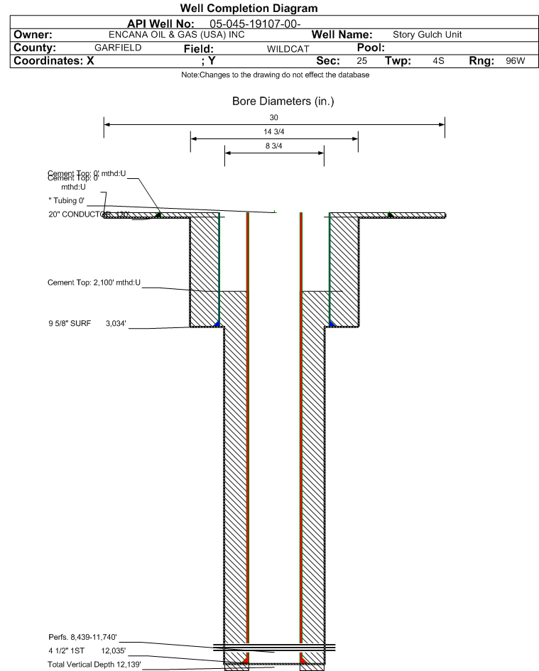 Wellbore #00 Wellbore Classification: GW Status: PR - 1/1/2022 Measured TD: 12230 ft. Vertical TD: 12139 ft.| Wellbore Data for Original Wellbore | Wellbore Classification: GW PR - 1/1/2022 | | Wellbore Permit | DIRECTIONAL | | Permit #: | | Expiration Date: | 2/2/2012 | | Proposed Top PZ Location: | Sec:25 Twp: 4S 96W | Footage: 2529 FNL 699 FWL | | Bottom Hole Location: | Sec:25 Twp: 4S 96 | Footage: 2544 FNL 660 FWL | | Proposed Depth/Form: | 13635 ft. | | Surface Mineral Owner Same: | No | | Mineral Owner: | FEDERAL | Surface Owner: | FEE | | Unit: | Story Gulch Unt | Unit Number: | COC69333X | | Casing: | String Type: CONDUCTOR, Hole Size: 26 in., Size: 20 in., Top: , Depth: 120 ft., Weight: Line Pipe, Citings Type: PLANNED | | Cement: | Sacks: 176, Top: 0 ft., Bottom: 120 ft. | | Casing: | String Type: SURF, Hole Size: 14.75 in., Size: 9.625 in., Top: , Depth: 3000 ft., Weight: 36 , Citings Type: PLANNED | | Cement: | Sacks: 2069, Top: 0 ft., Bottom: 3000 ft. | | Casing: | String Type: 1ST, Hole Size: 8.75 in., Size: 4.5 in., Top: , Depth: 13635 ft., Weight: 11.6 , Citings Type: PLANNED | | Cement: | Sacks: 857, Top: 7974 ft., Bottom: 13635 ft. |