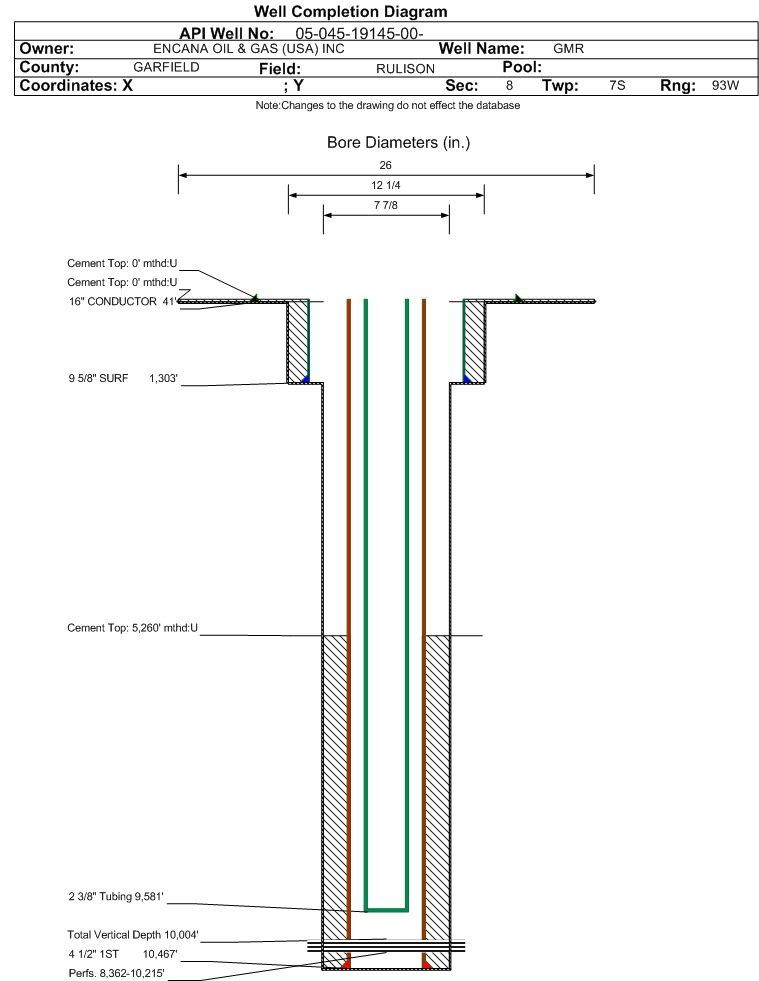 Wellbore #00 Wellbore Classification: GW Status: PR - 11/18/2010 Measured TD: 10482 ft. Vertical TD: 10004 ft.| Wellbore Data for Original Wellbore | Wellbore Classification: GW PR - 11/18/2010 | | Wellbore Permit | DIRECTIONAL | | Permit #: | | Expiration Date: | 2/17/2012 | | Proposed Top PZ Location: | Sec:8 Twp: 7S 93W | Footage: 1460 FNL 140 FWL | | Bottom Hole Location: | Sec:8 Twp: 7S 93W | Footage: 1460 FNL 140 FWL | | Proposed Depth/Form: | 10583 ft. | | Surface Mineral Owner Same: | Yes | | Mineral Owner: | FEE | Surface Owner: | FEE | | Unit: | | Unit Number: | | | Formation And Spacing: | Code: ILES , Formation: ILES , Order: 139-98 , Unit Acreage: 20, Drill Unit: | | Formation And Spacing: | Code: WMFK , Formation: WILLIAMS FORK , Order: 139-98 , Unit Acreage: 10, Drill Unit: | | Casing: | String Type: CONDUCTOR, Hole Size: 20 in., Size: 16 in., Top: , Depth: 40 ft., Weight: LINEPIPE , Citings Type: PLANNED | | Cement: | Sacks: 5, Top: 0 ft., Bottom: 40 ft. | | Casing: | String Type: SURF, Hole Size: 12.25 in., Size: 9.625 in., Top: , Depth: 1250 ft., Weight: 36 , Citings Type: PLANNED | | Cement: | Sacks: 703, Top: 0 ft., Bottom: 1250 ft. | | Casing: | String Type: 1ST, Hole Size: 8.75 in., Size: 4.5 in., Top: , Depth: 10583 ft., Weight: 11.6 , Citings Type: PLANNED | | Cement: | Sacks: 1089, Top: 0 ft., Bottom: 10583 ft. |