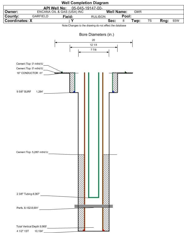 | Wellbore Completed | | Completion Date: | 7/20/2010 | | Spud Date: | 7/9/2010 | Spud Date Is: | ACTUAL | | Measured TD: | 10210 ft. | Measured PB depth: | 10148 ft. | | True Vertical TD: | 9969 ft. | True Vertical PB depth: | 9907 ft. | | Top PZ Location: | Sec:8 Twp: 7S 93W | Footage: 1436 FNL 2275 FWL | | Bottom Hole Location: | Sec:8 Twp: 7S 93W | Footage: 1455 FNL 2266 FWL | | Log Types: | RST, CBL and Mud. The attachment LAS.Nuetron (has the RST & CBL). | | Casing: | String Type: CONDUCTOR, Hole Size: 20 in., Size: 16 in., Top: 0 ft., Depth: 41 ft., Weight: Linepipe , Citings Type: ACTUAL | | Cement: | Sacks: 4, Top: 0 ft., Bottom: 40 ft., Determination Method: VISU | | Casing: | String Type: SURF, Hole Size: 12.25 in., Size: 9.625 in., Top: 0 ft., Depth: 1284 ft., Weight: 36 , Citings Type: ACTUAL | | Cement: | Sacks: 360, Top: 0 ft., Bottom: 1284 ft., Determination Method: CALC | | Casing: | String Type: 1ST, Hole Size: 7.875 in., Size: 4.5 in., Top: 0 ft., Depth: 10194 ft., Weight: 11.6 , Citings Type: ACTUAL | | Cement: | Sacks: 893, Top: 5280 ft., Bottom: 10194 ft., Determination Method: CBL | | Formation | Interval Top | Log Bottom | Cored | DSTs | | WILLIAMS FORK | 6981 ft. | 10128 ft. | | | | ROLLINS | 10129 ft. | 10210 ft. | | |