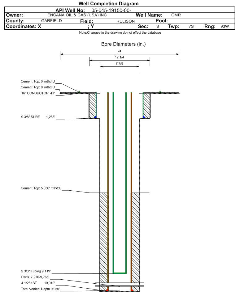 | Wellbore Completed | | Completion Date: | 9/18/2010 | | Spud Date: | 7/1/2010 | Spud Date Is: | ACTUAL | | Measured TD: | 10025 ft. | Measured PB depth: | 9967 ft. | | True Vertical TD: | 9950 ft. | True Vertical PB depth: | 9892 ft. | | Top PZ Location: | Sec:8 Twp: 7S 93W | Footage: 2387 FNL 2849 FEL | | Bottom Hole Location: | Sec:8 Twp: 7S 93W | Footage: 2388 FNL 2869 FEL | | Log Types: | RST and Cement Bond Logs (LAS format) uploaded to COGCC | | Casing: | String Type: CONDUCTOR, Hole Size: 24 in., Size: 16 in., Top: 0 ft., Depth: 41 ft., Weight: Linepipe , Citings Type: ACTUAL | | Cement: | Sacks: 40, Top: 0 ft., Bottom: 40 ft., Determination Method: CALC | | Casing: | String Type: SURF, Hole Size: 12.25 in., Size: 9.375 in., Top: 0 ft., Depth: 1288 ft., Weight: 36 , Citings Type: ACTUAL | | Cement: | Sacks: 413, Top: 0 ft., Bottom: 1300 ft., Determination Method: CALC | | Casing: | String Type: 1ST, Hole Size: 7.875 in., Size: 4.5 in., Top: 0 ft., Depth: 10010 ft., Weight: 11.6 , Citings Type: ACTUAL | | Cement: | Sacks: 791, Top: 5050 ft., Bottom: 10010 ft., Determination Method: CBL | | Formation | Interval Top | Log Bottom | Cored | DSTs | | WILLIAMS FORK | 6826 ft. | 9906 ft. | | | | ROLLINS | 9907 ft. | 10025 ft. | | |