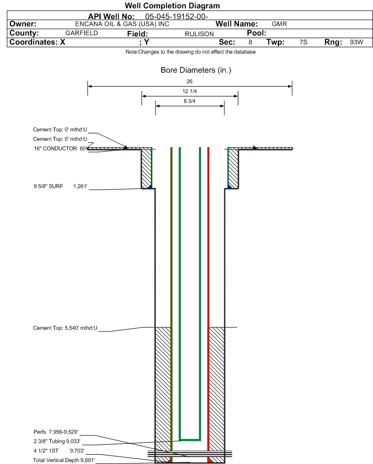 Wellbore #00 Wellbore Classification: GW Status: PR - 8/4/2011 Measured TD: 9732 ft. Vertical TD: 9691 ft.| Wellbore Data for Original Wellbore | Wellbore Classification: GW PR - 8/4/2011 | | Wellbore Permit | DIRECTIONAL | | Permit #: | | Expiration Date: | 2/17/2012 | | Proposed Top PZ Location: | Sec:8 Twp: 7S 93W | Footage: 2530 FSL 2354 FWL | | Bottom Hole Location: | Sec:8 Twp: 7S 93W | Footage: 2530 FSL 2354 FWL | | Proposed Depth/Form: | 10079 ft. | | Surface Mineral Owner Same: | Yes | | Mineral Owner: | FEE | Surface Owner: | FEE | | Unit: | | Unit Number: | | | Formation And Spacing: | Code: ILES , Formation: ILES , Order: 139-98 , Unit Acreage: 20, Drill Unit: | | Formation And Spacing: | Code: WMFK , Formation: WILLIAMS FORK , Order: 139-98 , Unit Acreage: 10, Drill Unit: | | Casing: | String Type: CONDUCTOR, Hole Size: 20 in., Size: 16 in., Top: , Depth: 40 ft., Weight: LINEPIPE , Citings Type: PLANNED | | Cement: | Sacks: 5, Top: 0 ft., Bottom: 40 ft. | | Casing: | String Type: SURF, Hole Size: 12.25 in., Size: 9.625 in., Top: , Depth: 1250 ft., Weight: 36 , Citings Type: PLANNED | | Cement: | Sacks: 703, Top: 0 ft., Bottom: 1250 ft. | | Casing: | String Type: 1ST, Hole Size: 8.75 in., Size: 4.5 in., Top: , Depth: 10079 ft., Weight: 11.6 , Citings Type: PLANNED | | Cement: | Sacks: 1089, Top: 0 ft., Bottom: 10079 ft. |
