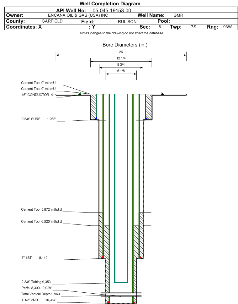 Wellbore #00 Wellbore Classification: GW Status: PR - 11/15/2010 Measured TD: 10380 ft. Vertical TD: 9963 ft.| Wellbore Data for Original Wellbore | Wellbore Classification: GW PR - 11/15/2010 | | Wellbore Permit | DIRECTIONAL | | Permit #: | | Expiration Date: | 2/17/2012 | | Proposed Top PZ Location: | Sec:8 Twp: 7S 93W | Footage: 1780 FNL 140 FWL | | Bottom Hole Location: | Sec:8 Twp: 7S 93W | Footage: 1780 FNL 140 FWL | | Proposed Depth/Form: | 10486 ft. | | Surface Mineral Owner Same: | Yes | | Mineral Owner: | FEE | Surface Owner: | FEE | | Unit: | | Unit Number: | | | Formation And Spacing: | Code: ILES , Formation: ILES , Order: 139-98 , Unit Acreage: 20, Drill Unit: | | Formation And Spacing: | Code: WMFK , Formation: WILLIAMS FORK , Order: 139-98 , Unit Acreage: 10, Drill Unit: | | Casing: | String Type: CONDUCTOR, Hole Size: 20 in., Size: 16 in., Top: , Depth: 40 ft., Weight: LINEPIPE , Citings Type: PLANNED | | Cement: | Sacks: 5, Top: 0 ft., Bottom: 40 ft. | | Casing: | String Type: SURF, Hole Size: 12.25 in., Size: 9.625 in., Top: , Depth: 1250 ft., Weight: 36 , Citings Type: PLANNED | | Cement: | Sacks: 703, Top: 0 ft., Bottom: 1250 ft. | | Casing: | String Type: 1ST, Hole Size: 8.75 in., Size: 4.5 in., Top: , Depth: 10486 ft., Weight: 11.6 , Citings Type: PLANNED | | Cement: | Sacks: 1089, Top: 0 ft., Bottom: 10486 ft. |