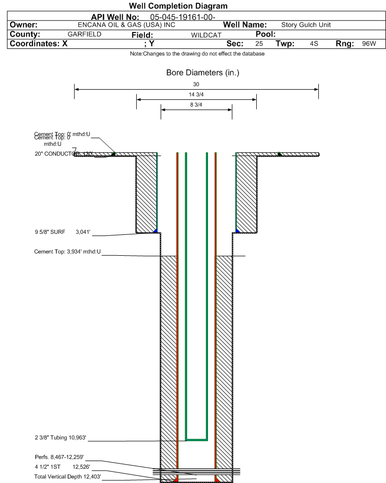 Wellbore #00 Wellbore Classification: GW Status: PR - 2/1/2021 Measured TD: 12545 ft. Vertical TD: 12403 ft.| Wellbore Data for Original Wellbore | Wellbore Classification: GW PR - 2/1/2021 | | Wellbore Permit | DIRECTIONAL | | Permit #: | | Expiration Date: | 2/19/2012 | | Proposed Top PZ Location: | Sec:25 Twp: 4S 96W | Footage: 1630 FNL 1993 FEL | | Bottom Hole Location: | Sec:25 Twp: 4S 96W | Footage: 1630 FNL 1993 FEL | | Proposed Depth/Form: | 13901 ft. | | Surface Mineral Owner Same: | No | | Mineral Owner: | FEDERAL | Surface Owner: | FEE | | Unit: | Story Gulch Unt | Unit Number: | COC69333X | | Formation And Spacing: | Code: ILES , Formation: ILES , Order: , Unit Acreage: , Drill Unit: | | Formation And Spacing: | Code: WMFK , Formation: WILLIAMS FORK , Order: 510-13 , Unit Acreage: 10, Drill Unit: | | Casing: | String Type: CONDUCTOR, Hole Size: 26 in., Size: 20 in., Top: , Depth: 120 ft., Weight: Line Pipe, Citings Type: PLANNED | | Cement: | Sacks: 176, Top: 0 ft., Bottom: 120 ft. | | Casing: | String Type: SURF, Hole Size: 14.75 in., Size: 9.625 in., Top: , Depth: 3000 ft., Weight: 36 , Citings Type: PLANNED | | Cement: | Sacks: 2069, Top: 0 ft., Bottom: 3000 ft. | | Casing: | String Type: 2ND, Hole Size: 8.75 in., Size: 4.5 in., Top: , Depth: 13901 ft., Weight: 11.6 , Citings Type: PLANNED | | Cement: | Sacks: 857, Top: 8241 ft., Bottom: 13901 ft. |