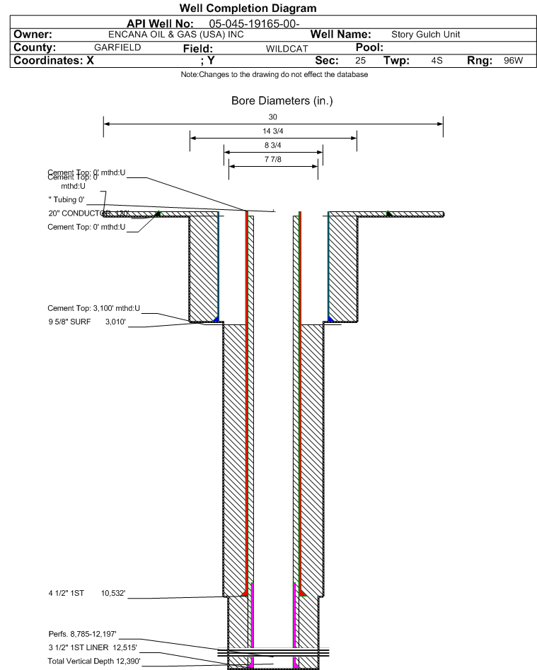 Wellbore #00 Wellbore Classification: GW Status: PR - 2/1/2021 Measured TD: 12515 ft. Vertical TD: 12390 ft.| Wellbore Data for Original Wellbore | Wellbore Classification: GW PR - 2/1/2021 | | Wellbore Permit | DIRECTIONAL | | Permit #: | | Expiration Date: | 2/19/2012 | | Proposed Top PZ Location: | Sec:25 Twp: 4S 96W | Footage: 2288 FNL 1999 FEL | | Bottom Hole Location: | Sec:25 Twp: 4S 96W | Footage: 2288 FNL 1999 FEL | | Proposed Depth/Form: | 13840 ft. | | Surface Mineral Owner Same: | No | | Mineral Owner: | FEDERAL | Surface Owner: | FEE | | Unit: | Story Gulch Unt | Unit Number: | COC69333X | | Formation And Spacing: | Code: ILES , Formation: ILES , Order: , Unit Acreage: , Drill Unit: | | Formation And Spacing: | Code: WMFK , Formation: WILLIAMS FORK , Order: 510-13 , Unit Acreage: 10, Drill Unit: | | Casing: | String Type: CONDUCTOR, Hole Size: 26 in., Size: 20 in., Top: , Depth: 120 ft., Weight: Line Pipe, Citings Type: PLANNED | | Cement: | Sacks: 176, Top: 0 ft., Bottom: 120 ft. | | Casing: | String Type: SURF, Hole Size: 14.75 in., Size: 9.625 in., Top: , Depth: 3000 ft., Weight: 36 , Citings Type: PLANNED | | Cement: | Sacks: 2069, Top: 0 ft., Bottom: 3000 ft. | | Casing: | String Type: 2ND, Hole Size: 8.75 in., Size: 8.75 in., Top: , Depth: 13840 ft., Weight: 11.6 , Citings Type: PLANNED | | Cement: | Sacks: 857, Top: 8180 ft., Bottom: 13840 ft. |