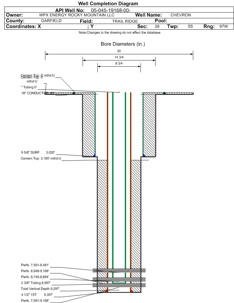 | Wellbore Completed | | Completion Date: | 8/23/2014 | | Spud Date: | 8/2/2014 | Spud Date Is: | ACTUAL | | Measured TD: | 9410 ft. | Measured PB depth: | 9346 ft. | | True Vertical TD: | 9297 ft. | True Vertical PB depth: | 9233 ft. | | Top PZ Location: | Sec:28 Twp: 5S 97W | Footage: 2131 FSL 1897 FWL | | Bottom Hole Location: | Sec:28 Twp: 5S 97W | Footage: 2124 FSL 1923 FWL | | Log Types: | SP/GR/HDIL/ZDL/CN/CBL/MUD | | Casing: | String Type: CONDUCTOR, Hole Size: 30 in., Size: 18 in., Top: 0 ft., Depth: 80 ft., Weight: 48 , Citings Type: ACTUAL | | Cement: | Sacks: 30, Top: 0 ft., Bottom: 80 ft., Determination Method: VISU | | Casing: | String Type: SURF, Hole Size: 14.75 in., Size: 9.625 in., Top: 0 ft., Depth: 3020 ft., Weight: 36 , Citings Type: ACTUAL | | Cement: | Sacks: 1760, Top: 0 ft., Bottom: 3020 ft., Determination Method: VISU | | Casing: | String Type: 1ST, Hole Size: 8.75 in., Size: 4.5 in., Top: 0 ft., Depth: 9397 ft., Weight: 11.6 , Citings Type: ACTUAL | | Cement: | Sacks: 1170, Top: 3185 ft., Bottom: 9397 ft., Determination Method: CBL | | Formation | Interval Top | Log Bottom | Cored | DSTs | | WASATCH G | 4281 ft. | | | | | MESAVERDE | 5802 ft. | | | | | CAMEO | 8082 ft. | | | | | ROLLINS | 8510 ft. | | | | | COZZETTE | 8691 ft. | | | | | CORCORAN | 8939 ft. | | | |