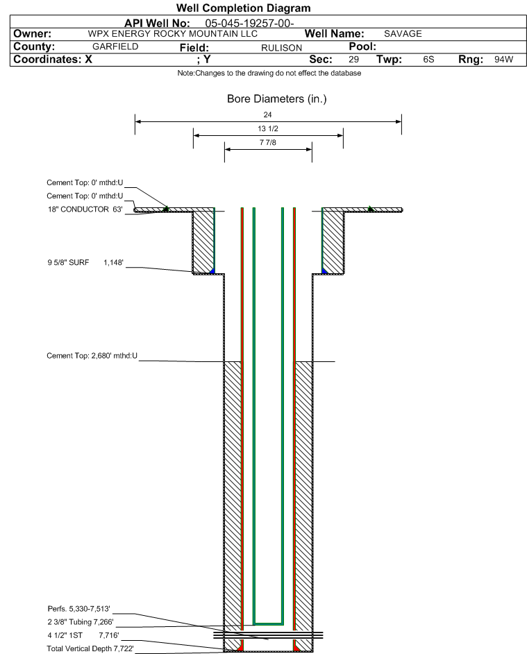 Wellbore #00 Wellbore Classification: GW Status: PR - 12/1/2022 Measured TD: 7739 ft. Vertical TD: 7722 ft.| Wellbore Data for Original Wellbore | Wellbore Classification: GW PR - 12/1/2022 | | Wellbore Permit | DIRECTIONAL | | Permit #: | | Expiration Date: | 3/23/2012 | | Proposed Top PZ Location: | Sec:29 Twp: 6S 94W | Footage: 2393 FSL 842 FEL | | Bottom Hole Location: | Sec:29 Twp: 6S 94W | Footage: 2393 FSL 842 FEL | | Proposed Depth/Form: | 7696 ft. | | Surface Mineral Owner Same: | No | | Mineral Owner: | FEE | Surface Owner: | FEE | | Unit: | | Unit Number: | | | Formation And Spacing: | Code: WMFK , Formation: WILLIAMS FORK , Order: 139-64 , Unit Acreage: 320, Drill Unit: S/2 | | Casing: | String Type: CONDUCTOR, Hole Size: 24 in., Size: 18 in., Top: , Depth: 45 ft., Weight: 48 , Citings Type: PLANNED | | Cement: | Sacks: 25, Top: 0 ft., Bottom: 45 ft. | | Casing: | String Type: SURF, Hole Size: 13.5 in., Size: 9.625 in., Top: , Depth: 1103 ft., Weight: 32.3 , Citings Type: PLANNED | | Cement: | Sacks: 385, Top: 0 ft., Bottom: 1103 ft. | | Casing: | String Type: 1ST, Hole Size: 7.875 in., Size: 4.5 in., Top: , Depth: 7696 ft., Weight: 11.6 , Citings Type: PLANNED | | Cement: | Sacks: 625, Top: , Bottom: 7696 ft. |