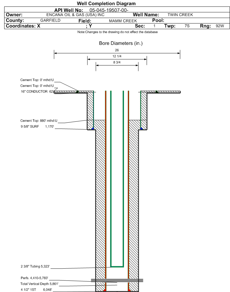 | Wellbore Completed | | Completion Date: | 9/19/2010 | | Spud Date: | 9/11/2010 | Spud Date Is: | ACTUAL | | Measured TD: | 6090 ft. | Measured PB depth: | 6004 ft. | | True Vertical TD: | 5861 ft. | True Vertical PB depth: | 5775 ft. | | Top PZ Location: | Sec:1 Twp: 7S 92W | Footage: 633 FNL 2460 FEL | | Bottom Hole Location: | Sec:1 Twp: 7S 92W | Footage: 652 FNL 2460 FEL | | Log Types: | RST, CBL (RST and CBL on same log) and Mud | | Casing: | String Type: CONDUCTOR, Hole Size: 26 in., Size: 16 in., Top: 0 ft., Depth: 62 ft., Weight: 42 , Citings Type: ACTUAL | | Cement: | Sacks: 40, Top: 0 ft., Bottom: 40 ft., Determination Method: CALC | | Casing: | String Type: SURF, Hole Size: 12.25 in., Size: 9.625 in., Top: 0 ft., Depth: 1170 ft., Weight: 36 , Citings Type: ACTUAL | | Cement: | Sacks: 569, Top: 0 ft., Bottom: 1170 ft., Determination Method: CALC | | Casing: | String Type: 1ST, Hole Size: 8.75 in., Size: 4.5 in., Top: 0 ft., Depth: 6048 ft., Weight: 12 , Citings Type: ACTUAL | | Cement: | Sacks: 1286, Top: 880 ft., Bottom: 6048 ft., Determination Method: CBL | | Formation | Interval Top | Log Bottom | Cored | DSTs | | WILLIAMS FORK | 3568 ft. | 6090 ft. | N | N |