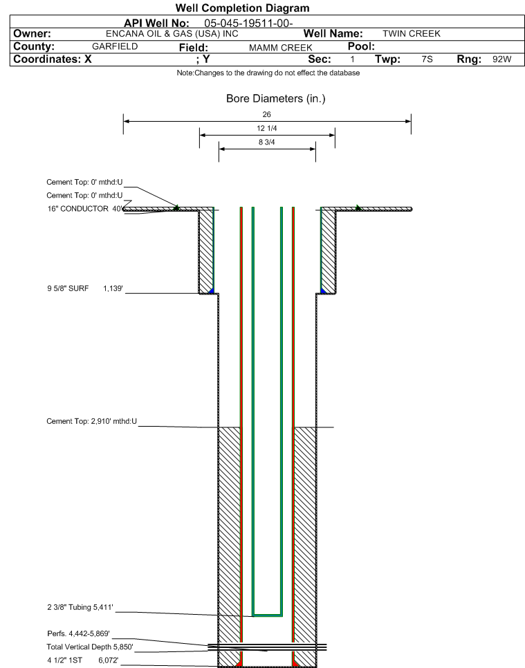 | Wellbore Completed | | Completion Date: | 11/16/2010 | | Spud Date: | 9/1/2010 | Spud Date Is: | ACTUAL | | Measured TD: | 6082 ft. | Measured PB depth: | 5920 ft. | | True Vertical TD: | 5850 ft. | True Vertical PB depth: | 5688 ft. | | Top PZ Location: | Sec:1 Twp: 7S 92W | Footage: 760 FNL 1123 FEL | | Bottom Hole Location: | Sec:1 Twp: 7S 92W | Footage: 769 FNL 1126 FEL | | Log Types: | RST, CBL (Triple Combo) and Mud. | | Casing: | String Type: CONDUCTOR, Hole Size: 26 in., Size: 16 in., Top: 0 ft., Depth: 40 ft., Weight: 42 , Citings Type: ACTUAL | | Cement: | Sacks: 40, Top: 0 ft., Bottom: 40 ft., Determination Method: CALC | | Casing: | String Type: SURF, Hole Size: 12.25 in., Size: 9.625 in., Top: 0 ft., Depth: 1139 ft., Weight: 36 , Citings Type: ACTUAL | | Cement: | Sacks: 551, Top: 0 ft., Bottom: 1139 ft., Determination Method: CALC | | Casing: | String Type: 1ST, Hole Size: 8.75 in., Size: 4.5 in., Top: 0 ft., Depth: 6072 ft., Weight: 12 , Citings Type: ACTUAL | | Cement: | Sacks: 1509, Top: 2910 ft., Bottom: 6082 ft., Determination Method: CBL | | Formation | Interval Top | Log Bottom | Cored | DSTs | | WILLIAMS FORK | 3647 ft. | 6082 ft. | N | N |