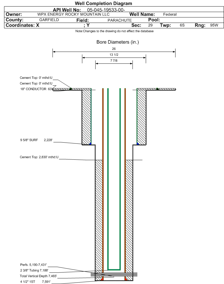 Wellbore #00 Wellbore Classification: GW Status: PR - 8/24/2012 Measured TD: 7605 ft. Vertical TD: 7465 ft.| Wellbore Data for Original Wellbore | Wellbore Classification: GW PR - 8/24/2012 | | Wellbore Permit | DIRECTIONAL | | Permit #: | | Expiration Date: | 5/24/2012 | | Proposed Top PZ Location: | Sec:29 Twp: 6S 95W | Footage: 1040 FSL 1237 FWL | | Bottom Hole Location: | Sec:29 Twp: 6S 29W | Footage: 1040 FSL 1237 FWL | | Proposed Depth/Form: | 7609 ft. | | Surface Mineral Owner Same: | Yes | | Mineral Owner: | FEDERAL | Surface Owner: | FEDERAL | | Unit: | | Unit Number: | | | Formation And Spacing: | Code: WMFK , Formation: WILLIAMS FORK , Order: 440-25 , Unit Acreage: , Drill Unit: Unspaced | | Casing: | String Type: CONDUCTOR, Hole Size: 24 in., Size: 18 in., Top: , Depth: 45 ft., Weight: 48 , Citings Type: PLANNED | | Cement: | Sacks: 25, Top: 0 ft., Bottom: 45 ft. | | Casing: | String Type: SURF, Hole Size: 13.5 in., Size: 9.625 in., Top: , Depth: 2162 ft., Weight: 32.3 , Citings Type: PLANNED | | Cement: | Sacks: 770, Top: 0 ft., Bottom: 2162 ft. | | Casing: | String Type: 1ST, Hole Size: 7.875 in., Size: 4.5 in., Top: , Depth: 7608 ft., Weight: 11.6 , Citings Type: PLANNED | | Cement: | Sacks: 601, Top: 5259 ft., Bottom: 7608 ft. |