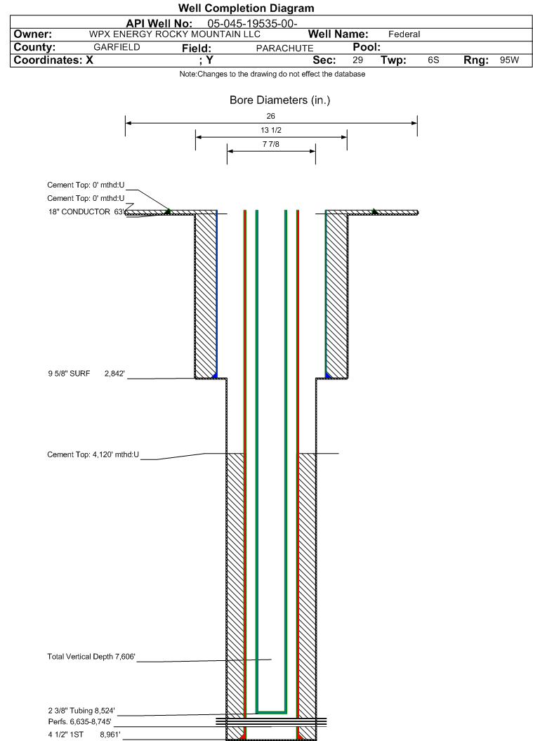 | Wellbore Completed | | Completion Date: | 5/23/2012 | | Spud Date: | 5/14/2012 | Spud Date Is: | ACTUAL | | Measured TD: | 8970 ft. | Measured PB depth: | 8923 ft. | | True Vertical TD: | 7606 ft. | True Vertical PB depth: | 7559 ft. | | Top PZ Location: | Sec:29 Twp: 6S 95W | Footage: 1501 FNL 286 FWL | | Bottom Hole Location: | Sec:29 Twp: 6S 95W | Footage: 1497 FNL 279 FWL | | Log Types: | CBL/RPM/MUD | | Casing: | String Type: CONDUCTOR, Hole Size: 26 in., Size: 18 in., Top: 0 ft., Depth: 63 ft., Weight: 48 , Citings Type: ACTUAL | | Cement: | Sacks: 37, Top: 0 ft., Bottom: 63 ft., Determination Method: VISU | | Casing: | String Type: SURF, Hole Size: 13.5 in., Size: 9.625 in., Top: 0 ft., Depth: 2842 ft., Weight: 32.3 , Citings Type: ACTUAL | | Cement: | Sacks: 625, Top: 0 ft., Bottom: 2842 ft., Determination Method: VISU | | Casing: | String Type: 1ST, Hole Size: 7.875 in., Size: 4.5 in., Top: 0 ft., Depth: 8961 ft., Weight: 11.6 , Citings Type: ACTUAL | | Cement: | Sacks: 980, Top: 4120 ft., Bottom: 8961 ft., Determination Method: CBL | | Formation | Interval Top | Log Bottom | Cored | DSTs | | WASATCH G | 2516 ft. | | | | | MESAVERDE | 5444 ft. | | | | | CAMEO | 8277 ft. | | | | | ROLLINS | 8870 ft. | | | |