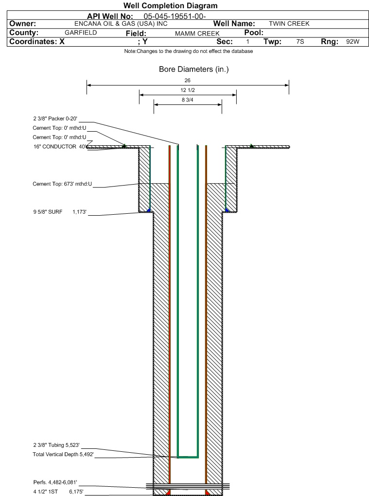 | Wellbore Completed | | Completion Date: | 11/8/2010 | | Spud Date: | 9/2/2010 | Spud Date Is: | ACTUAL | | Measured TD: | 6175 ft. | Measured PB depth: | 6130 ft. | | True Vertical TD: | 5492 ft. | True Vertical PB depth: | 5447 ft. | | Top PZ Location: | Sec:12 Twp: 7S 92W | Footage: 1075 FNL 1019 FEL | | Bottom Hole Location: | Sec:12 Twp: 7S 92W | Footage: 1140 FNL 1015 FEL | | Log Types: | RST, CBL (Triple Combo) and Mud | | Casing: | String Type: CONDUCTOR, Hole Size: 26 in., Size: 16 in., Top: 0 ft., Depth: 40 ft., Weight: 42 , Citings Type: ACTUAL | | Cement: | Sacks: 40, Top: 0 ft., Bottom: 40 ft., Determination Method: CALC | | Casing: | String Type: SURF, Hole Size: 12.5 in., Size: 9.625 in., Top: 0 ft., Depth: 1173 ft., Weight: 36 , Citings Type: ACTUAL | | Cement: | Sacks: 567, Top: 0 ft., Bottom: 1173 ft., Determination Method: CALC | | Casing: | String Type: 1ST, Hole Size: 8.75 in., Size: 4.5 in., Top: 0 ft., Depth: 6175 ft., Weight: 12 , Citings Type: ACTUAL | | Cement: | Sacks: 1499, Top: 673 ft., Bottom: 6175 ft., Determination Method: CBL | | Formation | Interval Top | Log Bottom | Cored | DSTs | | WILLIAMS FORK | 3662 ft. | 6175 ft. | N | N |