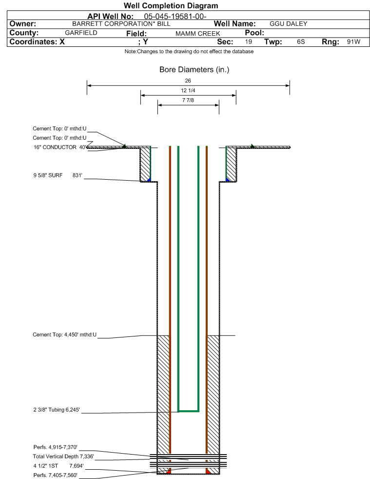 | Wellbore Completed | | Completion Date: | 6/6/2011 | | Spud Date: | 3/15/2011 | Spud Date Is: | ACTUAL | | Measured TD: | 7695 ft. | Measured PB depth: | 7647 ft. | | True Vertical TD: | 7336 ft. | True Vertical PB depth: | 7285 ft. | | Top PZ Location: | Sec:19 Twp: 6S 91W | Footage: 1106 FSL 705 FWL | | Bottom Hole Location: | Sec:19 Twp: 6S 91W | Footage: 1150 FSL 675 FWL | | Log Types: | | | Log Types: | CBL, Caliper, Triple Combo, Temperature | | Casing: | String Type: CONDUCTOR, Hole Size: 26 in., Size: 16 in., Top: 0 ft., Depth: 40 ft., Weight: 65 , Citings Type: ACTUAL | | Cement: | Sacks: , Top: 0 ft., Bottom: 40 ft., Determination Method: CALC | | Casing: | String Type: SURF, Hole Size: 12.25 in., Size: 9.625 in., Top: 0 ft., Depth: 831 ft., Weight: 36 , Citings Type: ACTUAL | | Cement: | Sacks: 240, Top: 0 ft., Bottom: 850 ft., Determination Method: CALC | | Casing: | String Type: 1ST, Hole Size: 7.875 in., Size: 4.5 in., Top: 0 ft., Depth: 7694 ft., Weight: 11.6 , Citings Type: ACTUAL | | Cement: | Sacks: 930, Top: 4450 ft., Bottom: 7695 ft., Determination Method: CBL | | Formation | Interval Top | Log Bottom | Cored | DSTs | | WILLIAMS FORK | 3731 ft. | | | | | ROLLINS | 7397 ft. | | | |
