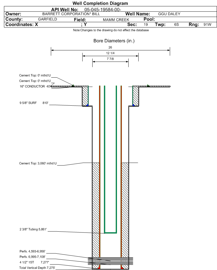 | Wellbore Completed | | Completion Date: | 4/24/2011 | | Spud Date: | 3/18/2011 | Spud Date Is: | ACTUAL | | Measured TD: | 7279 ft. | Measured PB depth: | 7233 ft. | | True Vertical TD: | 7275 ft. | True Vertical PB depth: | 7221 ft. | | Top PZ Location: | Sec:19 Twp: 6S 91W | Footage: 169 FSL 1991 FWL | | Bottom Hole Location: | Sec:19 Twp: 6S 91W | Footage: 161 FSL 1989 FWL | | Log Types: | | | Log Types: | CBL, Caliper, Triple Combo, Temperature | | Casing: | String Type: CONDUCTOR, Hole Size: 26 in., Size: 16 in., Top: 0 ft., Depth: 40 ft., Weight: 65 , Citings Type: ACTUAL | | Cement: | Sacks: , Top: 0 ft., Bottom: 40 ft., Determination Method: CALC | | Casing: | String Type: SURF, Hole Size: 12.25 in., Size: 9.625 in., Top: 0 ft., Depth: 810 ft., Weight: 36 , Citings Type: ACTUAL | | Cement: | Sacks: 240, Top: 0 ft., Bottom: 788 ft., Determination Method: CALC | | Casing: | String Type: 1ST, Hole Size: 7.875 in., Size: 4.5 in., Top: 0 ft., Depth: 7277 ft., Weight: 11.6 , Citings Type: ACTUAL | | Cement: | Sacks: 900, Top: 3060 ft., Bottom: 7279 ft., Determination Method: CBL | | Formation | Interval Top | Log Bottom | Cored | DSTs | | WILLIAMS FORK | 3410 ft. | | | | | ROLLINS | 6985 ft. | | | |