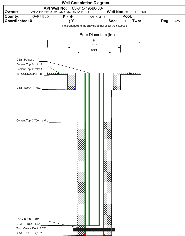 Wellbore #00 Wellbore Classification: GW Status: PR - 11/2/2011 Measured TD: 9125 ft. Vertical TD: 8772 ft.| Wellbore Data for Original Wellbore | Wellbore Classification: GW PR - 11/2/2011 | | Wellbore Permit | DIRECTIONAL | | Permit #: | | Expiration Date: | 6/10/2012 | | Proposed Top PZ Location: | Sec:21 Twp: 6S 95W | Footage: 568 FNL 2227 FWL | | Bottom Hole Location: | Sec:21 Twp: 6S 95W | Footage: 568 FNL 2227 FWL | | Proposed Depth/Form: | 9135 ft. | | Surface Mineral Owner Same: | Yes | | Mineral Owner: | FEDERAL | Surface Owner: | FEDERAL | | Unit: | | Unit Number: | | | Formation And Spacing: | Code: WMFK , Formation: WILLIAMS FORK , Order: 440-25 , Unit Acreage: , Drill Unit: Unspaced | | Casing: | String Type: CONDUCTOR, Hole Size: 24 in., Size: 18 in., Top: , Depth: 45 ft., Weight: 48 , Citings Type: PLANNED | | Cement: | Sacks: 25, Top: 0 ft., Bottom: 45 ft. | | Casing: | String Type: SURF, Hole Size: 13.5 in., Size: 9.625 in., Top: , Depth: 914 ft., Weight: 32.3 , Citings Type: PLANNED | | Cement: | Sacks: 319, Top: 0 ft., Bottom: 914 ft. | | Casing: | String Type: 1ST, Hole Size: 7.875 in., Size: 4.5 in., Top: , Depth: 9135 ft., Weight: 11.6 , Citings Type: PLANNED | | Cement: | Sacks: 634, Top: 5236 ft., Bottom: 9135 ft. |