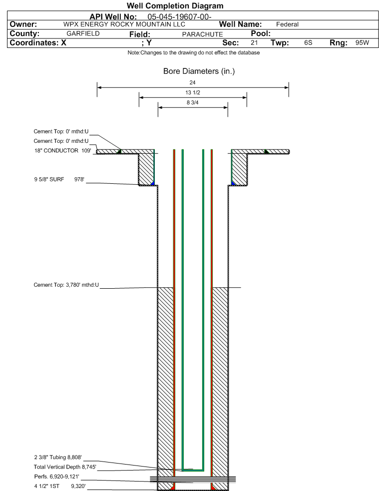 Wellbore #00 Wellbore Classification: GW Status: PR - 10/1/2011 Measured TD: 9331 ft. Vertical TD: 8745 ft.| Wellbore Data for Original Wellbore | Wellbore Classification: GW PR - 10/1/2011 | | Wellbore Permit | DIRECTIONAL | | Permit #: | | Expiration Date: | 6/10/2012 | | Proposed Top PZ Location: | Sec:16 Twp: 6S 95W | Footage: 129 FSL 866 FWL | | Bottom Hole Location: | Sec:16 Twp: 6S 95W | Footage: 129 FSL 866 FWL | | Proposed Depth/Form: | 9347 ft. | | Surface Mineral Owner Same: | Yes | | Mineral Owner: | FEDERAL | Surface Owner: | FEDERAL | | Unit: | | Unit Number: | | | Formation And Spacing: | Code: WMFK , Formation: WILLIAMS FORK , Order: 440-25 , Unit Acreage: , Drill Unit: Unspaced | | Casing: | String Type: CONDUCTOR, Hole Size: 24 in., Size: 18 in., Top: , Depth: 45 ft., Weight: 48 , Citings Type: PLANNED | | Cement: | Sacks: 25, Top: 0 ft., Bottom: 45 ft. | | Casing: | String Type: SURF, Hole Size: 13.5 in., Size: 9.625 in., Top: , Depth: 954 ft., Weight: 32.3 , Citings Type: PLANNED | | Cement: | Sacks: 333, Top: 0 ft., Bottom: 954 ft. | | Casing: | String Type: 1ST, Hole Size: 7.875 in., Size: 4.5 in., Top: , Depth: 9347 ft., Weight: 11.6 , Citings Type: PLANNED | | Cement: | Sacks: 634, Top: 5453 ft., Bottom: 9347 ft. |