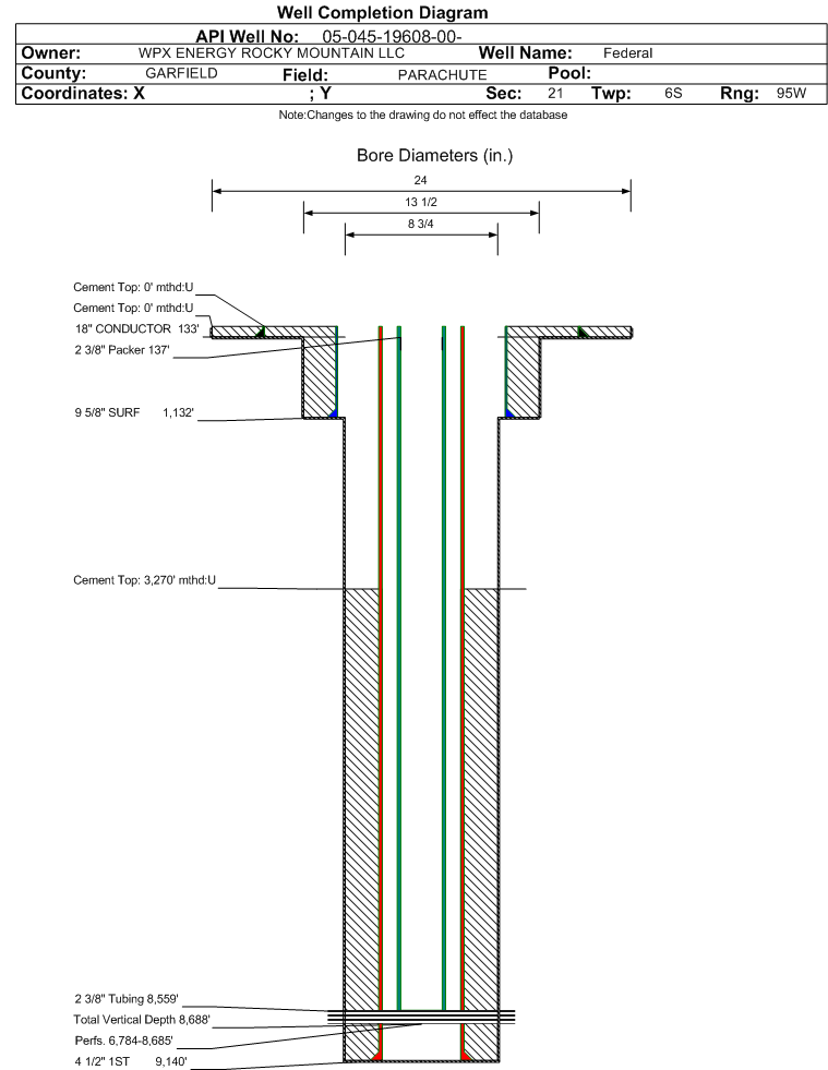 Wellbore #00 Wellbore Classification: GW Status: PR - 10/1/2011 Measured TD: 9155 ft. Vertical TD: 8688 ft.| Wellbore Data for Original Wellbore | Wellbore Classification: GW PR - 10/1/2011 | | Wellbore Permit | DIRECTIONAL | | Permit #: | | Expiration Date: | 6/10/2012 | | Proposed Top PZ Location: | Sec:21 Twp: 6S 95W | Footage: 202 FNL 790 FWL | | Bottom Hole Location: | Sec:21 Twp: 6S 95W | Footage: 202 FNL 790 FWL | | Proposed Depth/Form: | 9199 ft. | | Surface Mineral Owner Same: | Yes | | Mineral Owner: | FEDERAL | Surface Owner: | FEDERAL | | Unit: | | Unit Number: | | | Formation And Spacing: | Code: WMFK , Formation: WILLIAMS FORK , Order: 440-25 , Unit Acreage: , Drill Unit: Unspaced | | Casing: | String Type: CONDUCTOR, Hole Size: 24 in., Size: 18 in., Top: , Depth: 45 ft., Weight: 48 , Citings Type: PLANNED | | Cement: | Sacks: 25, Top: 0 ft., Bottom: 45 ft. | | Casing: | String Type: SURF, Hole Size: 13.5 in., Size: 9.625 in., Top: , Depth: 1132 ft., Weight: 32.3 , Citings Type: PLANNED | | Cement: | Sacks: 395, Top: 0 ft., Bottom: 1132 ft. | | Casing: | String Type: 1ST, Hole Size: 7.875 in., Size: 4.5 in., Top: , Depth: 9199 ft., Weight: 11.6 , Citings Type: PLANNED | | Cement: | Sacks: 631, Top: 5322 ft., Bottom: 9199 ft. |