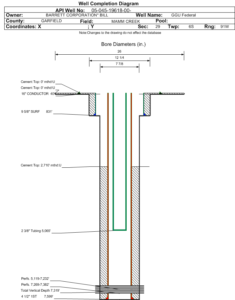 Wellbore #00 Wellbore Classification: GW Status: PR - 3/29/2011 Measured TD: 7600 ft. Vertical TD: 7319 ft.| Wellbore Data for Original Wellbore | Wellbore Classification: GW PR - 3/29/2011 | | Wellbore Permit | DIRECTIONAL | | Permit #: | | Expiration Date: | 6/16/2012 | | Proposed Top PZ Location: | Sec:29 Twp: 6S 91W | Footage: 1360 FSL 664 FEL | | Bottom Hole Location: | Sec:29 Twp: 6S 91W | Footage: 1360 FSL 664 FEL | | Proposed Depth/Form: | 7634 ft. | | Surface Mineral Owner Same: | No | | Mineral Owner: | FEDERAL | Surface Owner: | FEE | | Unit: | Gibson Gulch | Unit Number: | COC-052447X | | Formation And Spacing: | Code: ILES , Formation: ILES , Order: 191-65 , Unit Acreage: , Drill Unit: | | Formation And Spacing: | Code: WMFK , Formation: WILLIAMS FORK , Order: 191-9 , Unit Acreage: , Drill Unit: | | Casing: | String Type: CONDUCTOR, Hole Size: 26 in., Size: 16 in., Top: , Depth: 40 ft., Weight: 42# , Citings Type: PLANNED | | Cement: | Sacks: , Top: 0 ft., Bottom: 40 ft. | | Casing: | String Type: SURF, Hole Size: 12.25 in., Size: 9.625 in., Top: , Depth: 800 ft., Weight: 36# , Citings Type: PLANNED | | Cement: | Sacks: 250, Top: 0 ft., Bottom: 800 ft. | | Casing: | String Type: 1ST, Hole Size: 8.75 in., Size: 4.5 in., Top: , Depth: 7634 ft., Weight: 11.6# , Citings Type: PLANNED | | Cement: | Sacks: 510, Top: , Bottom: 7634 ft. |
