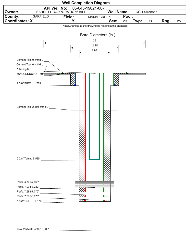 Wellbore #00 Wellbore Classification: GW Status: PR - 10/1/2014 Measured TD: 815 ft.| Wellbore Data for Original Wellbore | Wellbore Classification: GW PR - 10/1/2014 | | Wellbore Permit | DIRECTIONAL | | Permit #: | | Expiration Date: | 6/16/2012 | | Proposed Top PZ Location: | Sec:29 Twp: 6S 91W | Footage: 2548 FNL 2012 FEL | | Bottom Hole Location: | Sec:29 Twp: 6S 91W | Footage: 2516 FNL 2005 FEL | | Proposed Depth/Form: | 7417 ft. | | Surface Mineral Owner Same: | No | | Mineral Owner: | FEE | Surface Owner: | FEE | | Unit: | Gibson Gulch | Unit Number: | COC-052447X | | Formation And Spacing: | Code: ILES , Formation: ILES , Order: 191-9 , Unit Acreage: , Drill Unit: | | Formation And Spacing: | Code: WMFK , Formation: WILLIAMS FORK , Order: 191-65 , Unit Acreage: , Drill Unit: | | Casing: | String Type: CONDUCTOR, Hole Size: 26 in., Size: 16 in., Top: , Depth: 40 ft., Weight: 42# , Citings Type: PLANNED | | Cement: | Sacks: , Top: 0 ft., Bottom: 40 ft. | | Casing: | String Type: SURF, Hole Size: 12.25 in., Size: 9.625 in., Top: , Depth: 760 ft., Weight: 36# , Citings Type: PLANNED | | Cement: | Sacks: 240, Top: 0 ft., Bottom: 760 ft. | | Casing: | String Type: 1ST, Hole Size: 8.75 in., Size: 4.5 in., Top: , Depth: 7417 ft., Weight: 11.6# , Citings Type: PLANNED | | Cement: | Sacks: 520, Top: , Bottom: 7417 ft. |