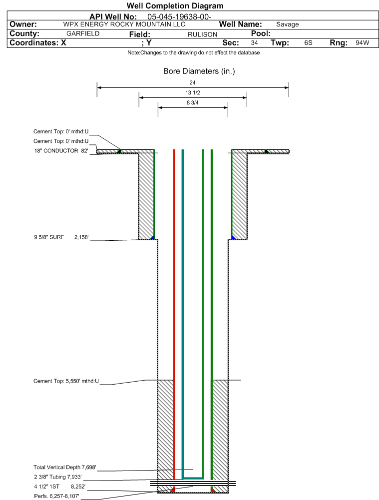 Wellbore #00 Wellbore Classification: GW Status: PR - 6/30/2011 Measured TD: 8262 ft. Vertical TD: 7698 ft.| Wellbore Data for Original Wellbore | Wellbore Classification: GW PR - 6/30/2011 | | Wellbore Permit | DIRECTIONAL | | Permit #: | | Expiration Date: | 6/16/2012 | | Proposed Top PZ Location: | Sec:3 Twp: 7S 94W | Footage: 1506 FNL 1972 FEL | | Bottom Hole Location: | Sec:3 Twp: 7S 94W | Footage: 1506 FNL 1972 FEL | | Proposed Depth/Form: | 8306 ft. | | Surface Mineral Owner Same: | No | | Mineral Owner: | FEDERAL | Surface Owner: | FEE | | Unit: | | Unit Number: | | | Formation And Spacing: | Code: WMFK , Formation: WILLIAMS FORK , Order: 139-64 , Unit Acreage: 640, Drill Unit: All | | Casing: | String Type: CONDUCTOR, Hole Size: 24 in., Size: 18 in., Top: , Depth: 45 ft., Weight: 48# , Citings Type: PLANNED | | Cement: | Sacks: 25, Top: 0 ft., Bottom: 45 ft. | | Casing: | String Type: SURF, Hole Size: 13.5 in., Size: 9.625 in., Top: , Depth: 1864 ft., Weight: 32.3# , Citings Type: PLANNED | | Cement: | Sacks: 651, Top: 0 ft., Bottom: 1864 ft. | | Casing: | String Type: 1ST, Hole Size: 7.875 in., Size: 4.5 in., Top: , Depth: 8306 ft., Weight: 11.6# , Citings Type: PLANNED | | Cement: | Sacks: 631, Top: , Bottom: 8306 ft. |