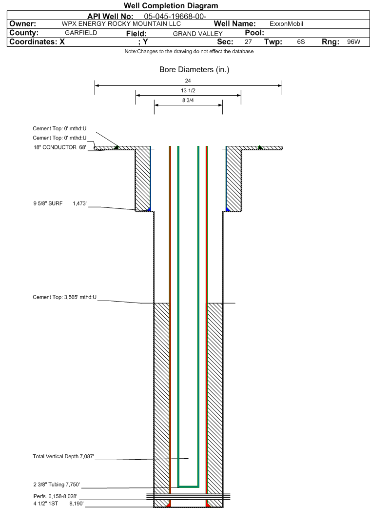 Wellbore #00 Wellbore Classification: GW Status: PR - 9/21/2011 Measured TD: 8210 ft. Vertical TD: 7087 ft.| Wellbore Data for Original Wellbore | Wellbore Classification: GW PR - 9/21/2011 | | Wellbore Permit | DIRECTIONAL | | Permit #: | | Expiration Date: | 6/28/2012 | | Proposed Top PZ Location: | Sec:26 Twp: 6S 96W | Footage: 978 FSL 1467 FWL | | Bottom Hole Location: | Sec:26 Twp: 6S 96W | Footage: 978 1467 FWL | | Proposed Depth/Form: | 7965 ft. | | Surface Mineral Owner Same: | Yes | | Mineral Owner: | FEE | Surface Owner: | FEE | | Unit: | | Unit Number: | | | Formation And Spacing: | Code: WMFK , Formation: WILLIAMS FORK , Order: 479-17 , Unit Acreage: 320, Drill Unit: W/2 | | Casing: | String Type: CONDUCTOR, Hole Size: 24 in., Size: 18 in., Top: , Depth: 45 ft., Weight: 48# , Citings Type: PLANNED | | Cement: | Sacks: 25, Top: 0 ft., Bottom: 45 ft. | | Casing: | String Type: SURF, Hole Size: 13.5 in., Size: 9.625 in., Top: , Depth: 1218 ft., Weight: 32.3# , Citings Type: PLANNED | | Cement: | Sacks: 425, Top: 0 ft., Bottom: 1218 ft. | | Casing: | String Type: 1ST, Hole Size: 7.875 in., Size: 4.5 in., Top: , Depth: 7965 ft., Weight: 11.6# , Citings Type: PLANNED | | Cement: | Sacks: 575, Top: , Bottom: 7965 ft. |