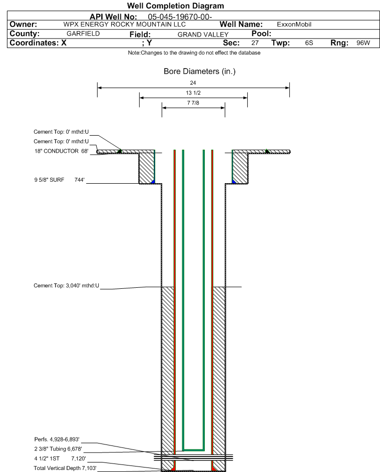 | Wellbore Completed | | Completion Date: | 4/6/2011 | | Spud Date: | 4/1/2011 | Spud Date Is: | ACTUAL | | Measured TD: | 7135 ft. | Measured PB depth: | 7090 ft. | | True Vertical TD: | 7103 ft. | True Vertical PB depth: | 7038 ft. | | Top PZ Location: | Sec:27 Twp: 6S 96W | Footage: 1406 FSL 1326 FEL | | Bottom Hole Location: | Sec:27 Twp: 6S 96W | Footage: 1396 FSL 1346 FEL | | Log Types: | CBL AND RPM