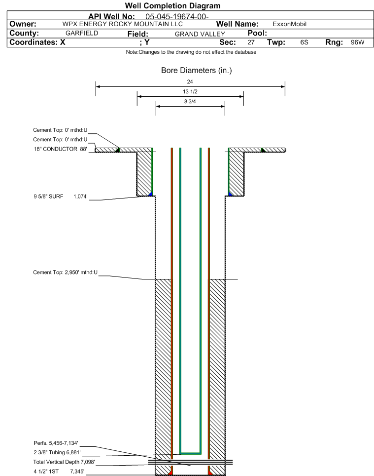 Wellbore #00 Wellbore Classification: GW Status: PR - 6/17/2011 Measured TD: 7360 ft. Vertical TD: 7098 ft.| Wellbore Data for Original Wellbore | Wellbore Classification: GW PR - 6/17/2011 | | Wellbore Permit | DIRECTIONAL | | Permit #: | | Expiration Date: | 6/28/2012 | | Proposed Top PZ Location: | Sec:26 Twp: 6S 96W | Footage: 2051 FSL 216 FWL | | Bottom Hole Location: | Sec:26 Twp: 6S 96W | Footage: 2051 FSL 216 FWL | | Proposed Depth/Form: | 7355 ft. | | Surface Mineral Owner Same: | Yes | | Mineral Owner: | FEE | Surface Owner: | FEE | | Unit: | | Unit Number: | | | Formation And Spacing: | Code: WMFK , Formation: WILLIAMS FORK , Order: 479-17 , Unit Acreage: 320, Drill Unit: W/2 | | Casing: | String Type: CONDUCTOR, Hole Size: 24.5 in., Size: 18 in., Top: , Depth: 45 ft., Weight: 48# , Citings Type: PLANNED | | Cement: | Sacks: 25, Top: 0 ft., Bottom: 45 ft. | | Casing: | String Type: SURF, Hole Size: 13.5 in., Size: 9.625 in., Top: , Depth: 1027 ft., Weight: 32.3# , Citings Type: PLANNED | | Cement: | Sacks: 358, Top: 0 ft., Bottom: 1027 ft. | | Casing: | String Type: 1ST, Hole Size: 7.875 in., Size: 4.5 in., Top: , Depth: 7355 ft., Weight: 11.6# , Citings Type: PLANNED | | Cement: | Sacks: 560, Top: , Bottom: 7355 ft. |