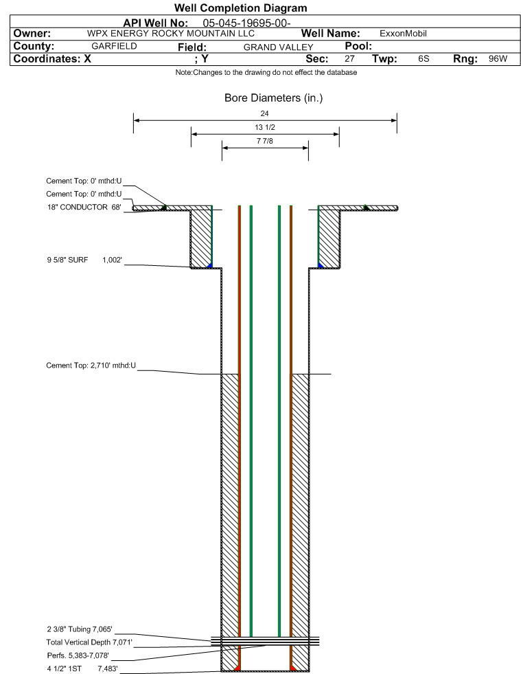 Wellbore #00 Wellbore Classification: GW Status: PR - 9/21/2011 Measured TD: 7500 ft. Vertical TD: 7071 ft.| Wellbore Data for Original Wellbore | Wellbore Classification: GW PR - 9/21/2011 | | Wellbore Permit | DIRECTIONAL | | Permit #: | | Expiration Date: | 7/20/2012 | | Proposed Top PZ Location: | Sec:27 Twp: 6S 96W | Footage: 142 FSL 503 FEL | | Bottom Hole Location: | Sec:27 Twp: 6S 96W | Footage: 142 FSL 503 FEL | | Proposed Depth/Form: | 7482 ft. | | Surface Mineral Owner Same: | No | | Mineral Owner: | FEDERAL | Surface Owner: | FEE | | Unit: | | Unit Number: | | | Formation And Spacing: | Code: WMFK , Formation: WILLIAMS FORK , Order: 479-12 , Unit Acreage: 320, Drill Unit: S/2 | | Casing: | String Type: CONDUCTOR, Hole Size: 24 in., Size: 18 in., Top: , Depth: 45 ft., Weight: 48# , Citings Type: PLANNED | | Cement: | Sacks: 25, Top: 0 ft., Bottom: 45 ft. | | Casing: | String Type: SURF, Hole Size: 13.5 in., Size: 9.625 in., Top: , Depth: 969 ft., Weight: 32.3# , Citings Type: PLANNED | | Cement: | Sacks: 340, Top: 0 ft., Bottom: 969 ft. | | Casing: | String Type: 1ST, Hole Size: 7.875 in., Size: 4.5 in., Top: , Depth: 7482 ft., Weight: 11.6# , Citings Type: PLANNED | | Cement: | Sacks: 560, Top: , Bottom: 7482 ft. |