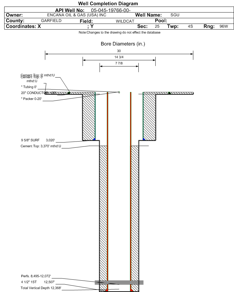 Wellbore #00 Wellbore Classification: GW Status: PR - 2/1/2021 Measured TD: 12530 ft. Vertical TD: 12368 ft.| Wellbore Data for Original Wellbore | Wellbore Classification: GW PR - 2/1/2021 | | Wellbore Permit | DIRECTIONAL | | Permit #: | | Expiration Date: | 8/3/2012 | | Proposed Top PZ Location: | Sec:25 Twp: 4S 96W | Footage: 2190 FNL 683 FEL | | Bottom Hole Location: | Sec:25 Twp: 4S 96W | Footage: 2190 FNL 683 FEL | | Proposed Depth/Form: | 14234 ft. | | Surface Mineral Owner Same: | No | | Mineral Owner: | FEDERAL | Surface Owner: | FEE | | Unit: | Big Jimmy Unit | Unit Number: | COC74105X | | Formation And Spacing: | Code: ILES , Formation: ILES , Order: , Unit Acreage: , Drill Unit: | | Formation And Spacing: | Code: WMFK , Formation: WILLIAMS FORK , Order: 510-13 , Unit Acreage: 10, Drill Unit: | | Casing: | String Type: CONDUCTOR, Hole Size: 26 in., Size: 20 in., Top: , Depth: 120 ft., Weight: Line Pipe, Citings Type: PLANNED | | Cement: | Sacks: 176, Top: 0 ft., Bottom: 120 ft. | | Casing: | String Type: SURF, Hole Size: 14.75 in., Size: 9.625 in., Top: , Depth: 3000 ft., Weight: 36 , Citings Type: PLANNED | | Cement: | Sacks: 1047, Top: 0 ft., Bottom: 3000 ft. | | Casing: | String Type: 1ST, Hole Size: 7.875 in., Size: 4.5 in., Top: , Depth: 14234 ft., Weight: 11.6 , Citings Type: PLANNED | | Cement: | Sacks: 645, Top: 8574 ft., Bottom: 14234 ft. |