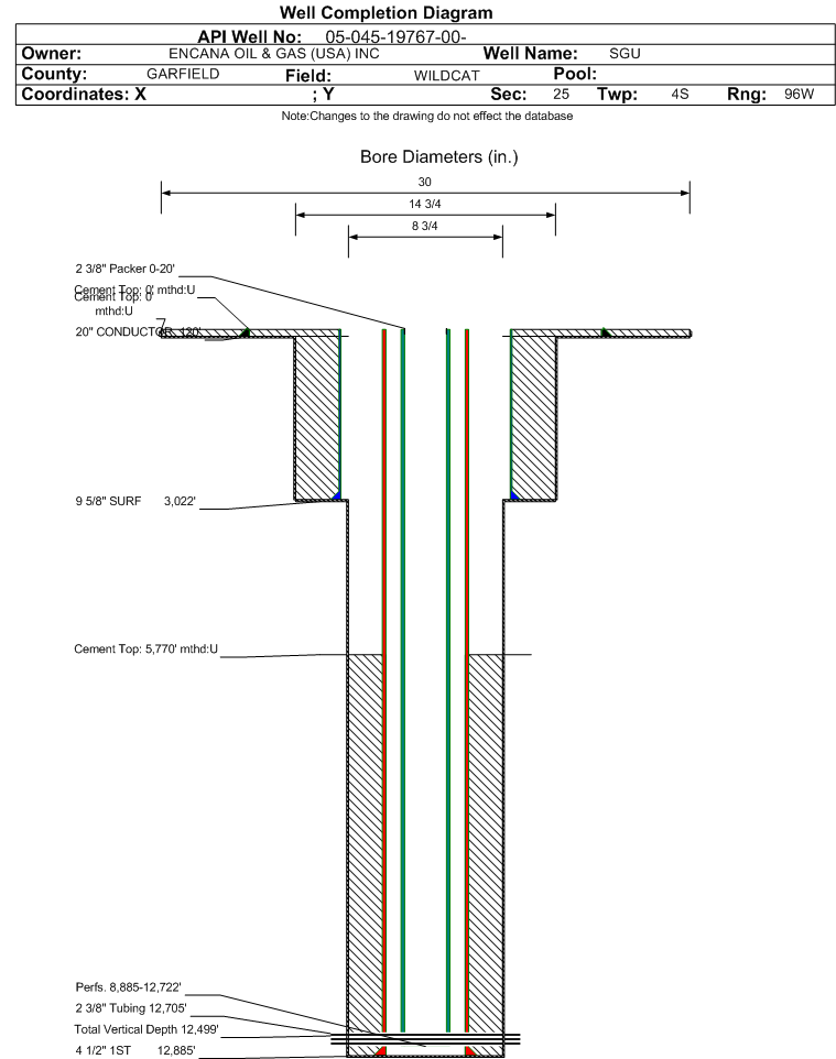 Wellbore #00 Wellbore Classification: GW Status: PR - 8/14/2012 Measured TD: 12910 ft. Vertical TD: 12499 ft.| Wellbore Data for Original Wellbore | Wellbore Classification: GW PR - 8/14/2012 | | Wellbore Permit | DIRECTIONAL | | Permit #: | | Expiration Date: | 8/3/2012 | | Proposed Top PZ Location: | Sec:25 Twp: 4S 96W | Footage: 632 FNL 1990 FEL | | Bottom Hole Location: | Sec:25 Twp: 4S 96W | Footage: 632 FNL 1990 FEL | | Proposed Depth/Form: | 14087 ft. | | Surface Mineral Owner Same: | No | | Mineral Owner: | FEDERAL | Surface Owner: | FEE | | Unit: | Big Jimmy Unit | Unit Number: | COC74105X | | Formation And Spacing: | Code: ILES , Formation: ILES , Order: , Unit Acreage: , Drill Unit: | | Formation And Spacing: | Code: WMFK , Formation: WILLIAMS FORK , Order: 510-13 , Unit Acreage: 10, Drill Unit: | | Casing: | String Type: CONDUCTOR, Hole Size: 26 in., Size: 20 in., Top: , Depth: 120 ft., Weight: Line Pipe, Citings Type: PLANNED | | Cement: | Sacks: 176, Top: 0 ft., Bottom: 120 ft. | | Casing: | String Type: SURF, Hole Size: 14.75 in., Size: 9.625 in., Top: , Depth: 3000 ft., Weight: 36 , Citings Type: PLANNED | | Cement: | Sacks: 1047, Top: 0 ft., Bottom: 3000 ft. | | Casing: | String Type: 1ST, Hole Size: 7.875 in., Size: 4.5 in., Top: , Depth: 14087 ft., Weight: 11.6 , Citings Type: PLANNED | | Cement: | Sacks: 645, Top: 8427 ft., Bottom: 14087 ft. |