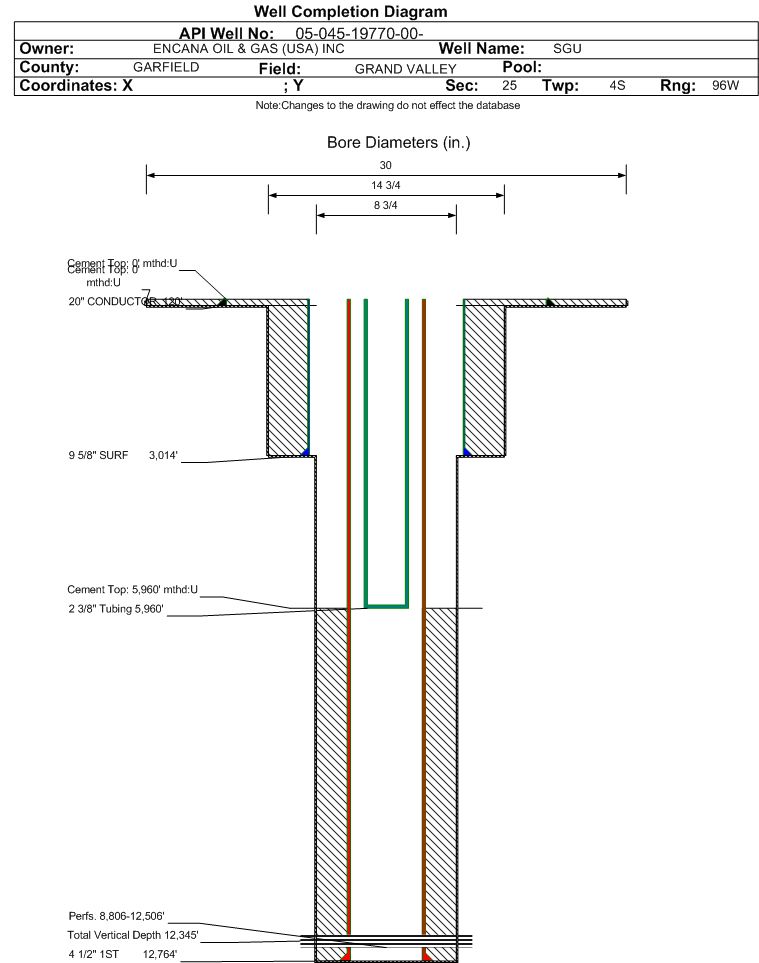 Wellbore #00 Wellbore Classification: GW Status: PR - 11/25/2011 Measured TD: 12790 ft. Vertical TD: 12345 ft.| Wellbore Data for Original Wellbore | Wellbore Classification: GW PR - 11/25/2011 | | Wellbore Permit | DIRECTIONAL | | Permit #: | | Expiration Date: | 8/3/2012 | | Proposed Top PZ Location: | Sec:24 Twp: 4S 96W | Footage: 16 FSL 659 FWL | | Bottom Hole Location: | Sec:24 Twp: 4S 96W | Footage: 33 FSL 667 FWL | | Proposed Depth/Form: | 13873 ft. | | Surface Mineral Owner Same: | No | | Mineral Owner: | FEDERAL | Surface Owner: | FEE | | Unit: | Big Jimmy Unit | Unit Number: | COC74105X | | Formation And Spacing: | Code: ILES , Formation: ILES , Order: , Unit Acreage: , Drill Unit: | | Formation And Spacing: | Code: WMFK , Formation: WILLIAMS FORK , Order: 510-13 , Unit Acreage: 10, Drill Unit: | | Casing: | String Type: CONDUCTOR, Hole Size: 26 in., Size: 20 in., Top: , Depth: 120 ft., Weight: Line Pipe, Citings Type: PLANNED | | Cement: | Sacks: 176, Top: 0 ft., Bottom: 120 ft. | | Casing: | String Type: SURF, Hole Size: 14.75 in., Size: 9.625 in., Top: , Depth: 3000 ft., Weight: 36 , Citings Type: PLANNED | | Cement: | Sacks: 1047, Top: 0 ft., Bottom: 3000 ft. | | Casing: | String Type: 1ST, Hole Size: 7.875 in., Size: 4.5 in., Top: , Depth: 13873 ft., Weight: 11.6 , Citings Type: PLANNED | | Cement: | Sacks: 645, Top: 8213 ft., Bottom: 13873 ft. |