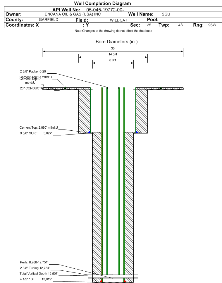 Wellbore #00 Wellbore Classification: GW Status: PR - 7/12/2012 Measured TD: 13040 ft. Vertical TD: 12507 ft.| Wellbore Data for Original Wellbore | Wellbore Classification: GW PR - 7/12/2012 | | Wellbore Permit | DIRECTIONAL | | Permit #: | | Expiration Date: | 8/3/2012 | | Proposed Top PZ Location: | Sec:24 Twp: 4S 96W | Footage: 63 FSL 1982 FEL | | Bottom Hole Location: | Sec:24 Twp: 4S 96W | Footage: 63 FSL 1982 FEL | | Proposed Depth/Form: | 14291 ft. | | Surface Mineral Owner Same: | No | | Mineral Owner: | FEDERAL | Surface Owner: | FEE | | Unit: | Big Jimmy Unit | Unit Number: | COC74105X | | Formation And Spacing: | Code: ILES , Formation: ILES , Order: , Unit Acreage: , Drill Unit: | | Formation And Spacing: | Code: WMFK , Formation: WILLIAMS FORK , Order: 510-13 , Unit Acreage: 10, Drill Unit: | | Casing: | String Type: CONDUCTOR, Hole Size: 26 in., Size: 20 in., Top: , Depth: 120 ft., Weight: Line Pipe, Citings Type: PLANNED | | Cement: | Sacks: 176, Top: 0 ft., Bottom: 120 ft. | | Casing: | String Type: SURF, Hole Size: 14.75 in., Size: 9.625 in., Top: , Depth: 3000 ft., Weight: 36 , Citings Type: PLANNED | | Cement: | Sacks: 1047, Top: 0 ft., Bottom: 3000 ft. | | Casing: | String Type: 1ST, Hole Size: 7.875 in., Size: 4.5 in., Top: , Depth: 14291 ft., Weight: 11.6 , Citings Type: PLANNED | | Cement: | Sacks: 645, Top: 8631 ft., Bottom: 14291 ft. |