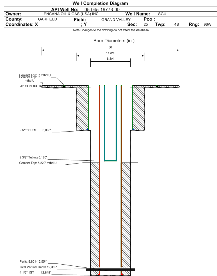 | Wellbore Completed | | Completion Date: | 3/19/2011 | | Spud Date: | 1/1/2011 | Spud Date Is: | ACTUAL | | Measured TD: | 12860 ft. | Measured PB depth: | 12823 ft. | | True Vertical TD: | 12360 ft. | True Vertical PB depth: | 12323 ft. | | Top PZ Location: | Sec:24 Twp: 4S 96W | Footage: 238 FSL 741 FWL | | Bottom Hole Location: | Sec:24 Twp: 4S 96W | Footage: 277 FSL 706 FWL | | Log Types: | RST, CBL (Triple Combo SCMT_RST_PSP) and Mud. | | Casing: | String Type: CONDUCTOR, Hole Size: 30 in., Size: 20 in., Top: 0 ft., Depth: 120 ft., Weight: 53 , Citings Type: ACTUAL | | Cement: | Sacks: 207, Top: 0 ft., Bottom: 120 ft., Determination Method: CALC | | Casing: | String Type: SURF, Hole Size: 14.75 in., Size: 9.625 in., Top: 0 ft., Depth: 3033 ft., Weight: 36 , Citings Type: ACTUAL | | Cement: | Sacks: 1127, Top: 0 ft., Bottom: 3055 ft., Determination Method: CALC | | Casing: | String Type: 1ST, Hole Size: 8.75 in., Size: 4.5 in., Top: 0 ft., Depth: 12848 ft., Weight: 12 , Citings Type: ACTUAL | | Cement: | Sacks: 2192, Top: 5220 ft., Bottom: 12860 ft., Determination Method: CBL | | Formation | Interval Top | Log Bottom | Cored | DSTs | | WILLIAMS FORK | 8679 ft. | 12736 ft. | N | N | | ROLLINS | 12737 ft. | 12860 ft. | N | N |