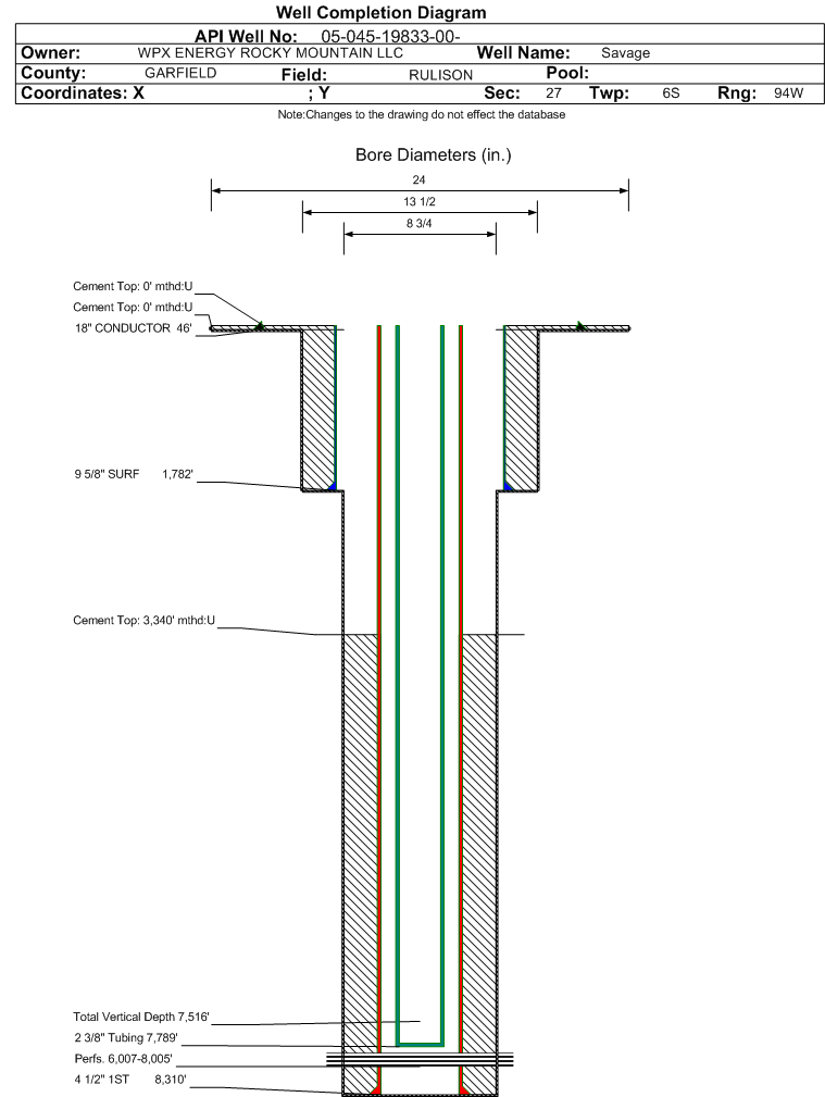 Wellbore #00 Wellbore Classification: GW Status: PR - 9/30/2012 Measured TD: 8320 ft. Vertical TD: 7516 ft.| Wellbore Data for Original Wellbore | Wellbore Classification: GW PR - 9/30/2012 | | Wellbore Permit | DIRECTIONAL | | Permit #: | | Expiration Date: | 6/13/2014 | | Proposed Top PZ Location: | Sec:34 Twp: 6S 94W | Footage: 1988 FNL 2106 FWL | | Bottom Hole Location: | Sec:34 Twp: 6S 94W | Footage: 1988 FNL 2106 FWL | | Proposed Depth/Form: | 8341 ft. | | Surface Mineral Owner Same: | Yes | | Mineral Owner: | FEE | Surface Owner: | FEE | | Unit: | | Unit Number: | | | Formation And Spacing: | Code: WMFK , Formation: WILLIAMS FORK , Order: 139-66 , Unit Acreage: 640, Drill Unit: All | | Casing: | String Type: CONDUCTOR, Hole Size: 24 in., Size: 18 in., Top: 0 ft., Depth: 45 ft., Weight: 48# , Citings Type: PLANNED | | Cement: | Sacks: 25, Top: 0 ft., Bottom: 45 ft. | | Casing: | String Type: SURF, Hole Size: 13.5 in., Size: 9.625 in., Top: 0 ft., Depth: 1756 ft., Weight: 32.3# , Citings Type: PLANNED | | Cement: | Sacks: 597, Top: 0 ft., Bottom: 1756 ft. | | Casing: | String Type: 1ST, Hole Size: 7.875 in., Size: 4.5 in., Top: 0 ft., Depth: 8341 ft., Weight: 11.6# , Citings Type: PLANNED | | Cement: | Sacks: 710, Top: , Bottom: 8341 ft. |