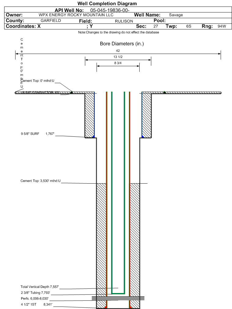 Wellbore #00 Wellbore Classification: GW Status: PR - 9/30/2012 Measured TD: 8365 ft. Vertical TD: 7557 ft.| Wellbore Data for Original Wellbore | Wellbore Classification: GW PR - 9/30/2012 | | Wellbore Permit | DIRECTIONAL | | Permit #: | | Expiration Date: | 6/13/2014 | | Proposed Top PZ Location: | Sec:34 Twp: 6S 94W | Footage: 1479 FNL 1295 FWL | | Bottom Hole Location: | Sec:34 Twp: 6S 94W | Footage: 1479 FNL 1295 FWL | | Proposed Depth/Form: | 8343 ft. | | Surface Mineral Owner Same: | Yes | | Mineral Owner: | FEE | Surface Owner: | FEE | | Unit: | | Unit Number: | | | Formation And Spacing: | Code: WMFK , Formation: WILLIAMS FORK , Order: 139-64 , Unit Acreage: 640, Drill Unit: All | | Casing: | String Type: CONDUCTOR, Hole Size: 24 in., Size: 18 in., Top: 0 ft., Depth: 45 ft., Weight: 48# , Citings Type: PLANNED | | Cement: | Sacks: 25, Top: 0 ft., Bottom: 45 ft. | | Casing: | String Type: SURF, Hole Size: 13.5 in., Size: 9.625 in., Top: 0 ft., Depth: 1751 ft., Weight: 32.3# , Citings Type: PLANNED | | Cement: | Sacks: 610, Top: 0 ft., Bottom: 1751 ft. | | Casing: | String Type: 1ST, Hole Size: 7.875 in., Size: 4.5 in., Top: 0 ft., Depth: 8343 ft., Weight: 11.6# , Citings Type: PLANNED | | Cement: | Sacks: 715, Top: , Bottom: 8343 ft. |