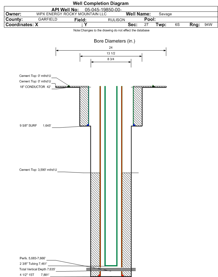 Wellbore #00 Wellbore Classification: GW Status: PR - 3/5/2013 Measured TD: 7900 ft. Vertical TD: 7635 ft.| Wellbore Data for Original Wellbore | Wellbore Classification: GW PR - 3/5/2013 | | Wellbore Permit | DIRECTIONAL | | Permit #: | | Expiration Date: | 6/13/2014 | | Proposed Top PZ Location: | Sec:27 Twp: 6S 94W | Footage: 255 FSL 621 FEL | | Bottom Hole Location: | Sec:27 Twp: 6S 94W | Footage: 255 FSL 621 FEL | | Proposed Depth/Form: | 7924 ft. | | Surface Mineral Owner Same: | Yes | | Mineral Owner: | FEE | Surface Owner: | FEE | | Unit: | | Unit Number: | | | Formation And Spacing: | Code: WMFK , Formation: WILLIAMS FORK , Order: 139-66 , Unit Acreage: 320, Drill Unit: E/2 | | Casing: | String Type: CONDUCTOR, Hole Size: 24 in., Size: 18 in., Top: 0 ft., Depth: 45 ft., Weight: 48# , Citings Type: PLANNED | | Cement: | Sacks: 25, Top: 0 ft., Bottom: 45 ft. | | Casing: | String Type: SURF, Hole Size: 13.5 in., Size: 9.625 in., Top: 0 ft., Depth: 1112 ft., Weight: 32.3# , Citings Type: PLANNED | | Cement: | Sacks: 383, Top: 0 ft., Bottom: 1112 ft. | | Casing: | String Type: 1ST, Hole Size: 7.875 in., Size: 4.5 in., Top: 0 ft., Depth: 7924 ft., Weight: 11.6# , Citings Type: PLANNED | | Cement: | Sacks: 675, Top: , Bottom: 7924 ft. |