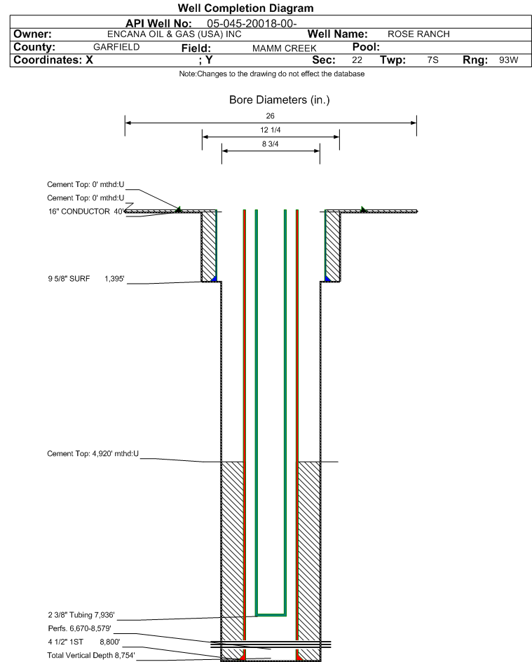 | Wellbore Completed | | Completion Date: | 1/26/2011 | | Spud Date: | 11/23/2010 | Spud Date Is: | ACTUAL | | Measured TD: | 8800 ft. | Measured PB depth: | 8756 ft. | | True Vertical TD: | 8754 ft. | True Vertical PB depth: | 8710 ft. | | Top PZ Location: | Sec:22 Twp: 7S 93W | Footage: 1505 FNL 321 FEL | | Bottom Hole Location: | Sec:22 Twp: 7S 93W | Footage: 1529 FNL 322 FEL | | Log Types: | RST, CBL (same log) and Mud. | | Casing: | String Type: CONDUCTOR, Hole Size: 26 in., Size: 16 in., Top: 0 ft., Depth: 40 ft., Weight: 42 , Citings Type: ACTUAL | | Cement: | Sacks: 40, Top: 0 ft., Bottom: 40 ft., Determination Method: CALC | | Casing: | String Type: SURF, Hole Size: 12.25 in., Size: 9.625 in., Top: 0 ft., Depth: 1395 ft., Weight: 36 , Citings Type: ACTUAL | | Cement: | Sacks: 443, Top: 0 ft., Bottom: 1395 ft., Determination Method: CALC | | Casing: | String Type: 1ST, Hole Size: 8.75 in., Size: 4.5 in., Top: 0 ft., Depth: 8800 ft., Weight: 12 , Citings Type: ACTUAL | | Cement: | Sacks: 912, Top: 4920 ft., Bottom: 8800 ft., Determination Method: CBL | | Formation | Interval Top | Log Bottom | Cored | DSTs | | WILLIAMS FORK | 5565 ft. | 8800 ft. | N | N |